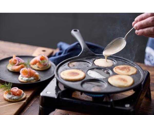 Blinispande med 7 huller, fremstillet i oliebehandlet støbejern. Oliebehandlingen lægger bunden til en naturlig belægning, som giver gode stegeegenskaber, og støbejernet fastholder og fordeler varmen jævnt og effektivt. Blinispanden kan bruges til andet end traditionelle blinis, fx små æggepandekager, kartoffelrøsti, tortillas og spejlæg med krydderier.