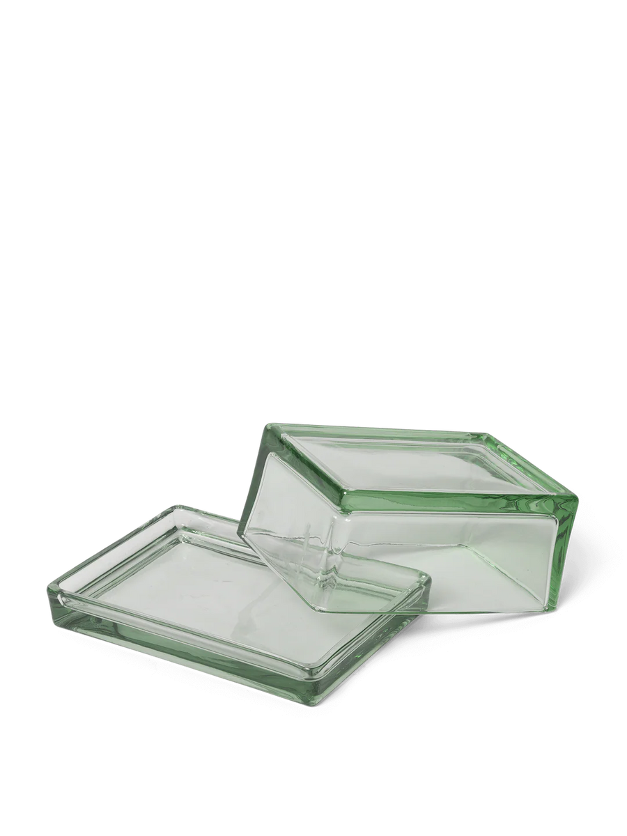 Oli Box er en multifunktionel glasbeholder, der kan bruges på mange forskellige måder til opbevaring af mindre ting, f.eks. til at holde smørret frisk i køleskabet, udstille smykker eller opbevare vatrondeller på badeværelset. Oli Box er fremstillet af 100 % genbrugsglas og er både dekorativ og praktisk, og det gør den ideel til åben opbevaring på hylder.
