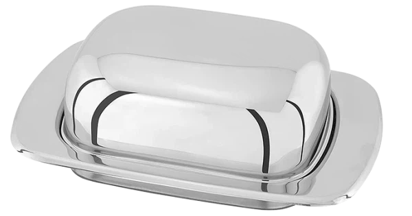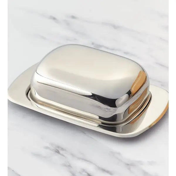 Vores kuppelformede smørserveringsfad i rustfrit stål er et klassisk design, og det kuppelformede låg sikrer, at smørret kan opbevares i køleskabet efter servering. På trods af at det har en poleret, spejlfinish til det rustfri stål, tåler det stadig opvaskemaskine for nem brug.