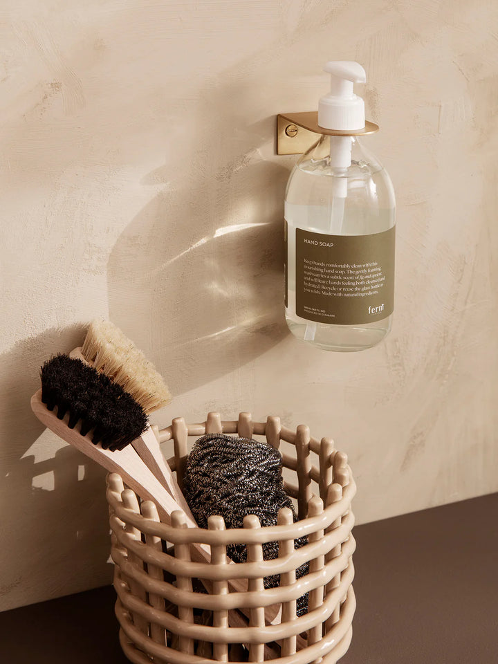 Basho Wall Hanger hjælper dig med at frigøre værdifuld plads på overfladen omkring vasken i køkkenet eller på badeværelset, fordi du kan hænge dine rengørings- og håndplejeprodukter på væggen. Denne praktiske og elegante vægmonterede løsning er lavet af massiv messing og har en fin belægning af klar lak, der gør det nemt at tørre vand og sæberester af. Passer til alle flasker fra vores Care & Cleaning Collection