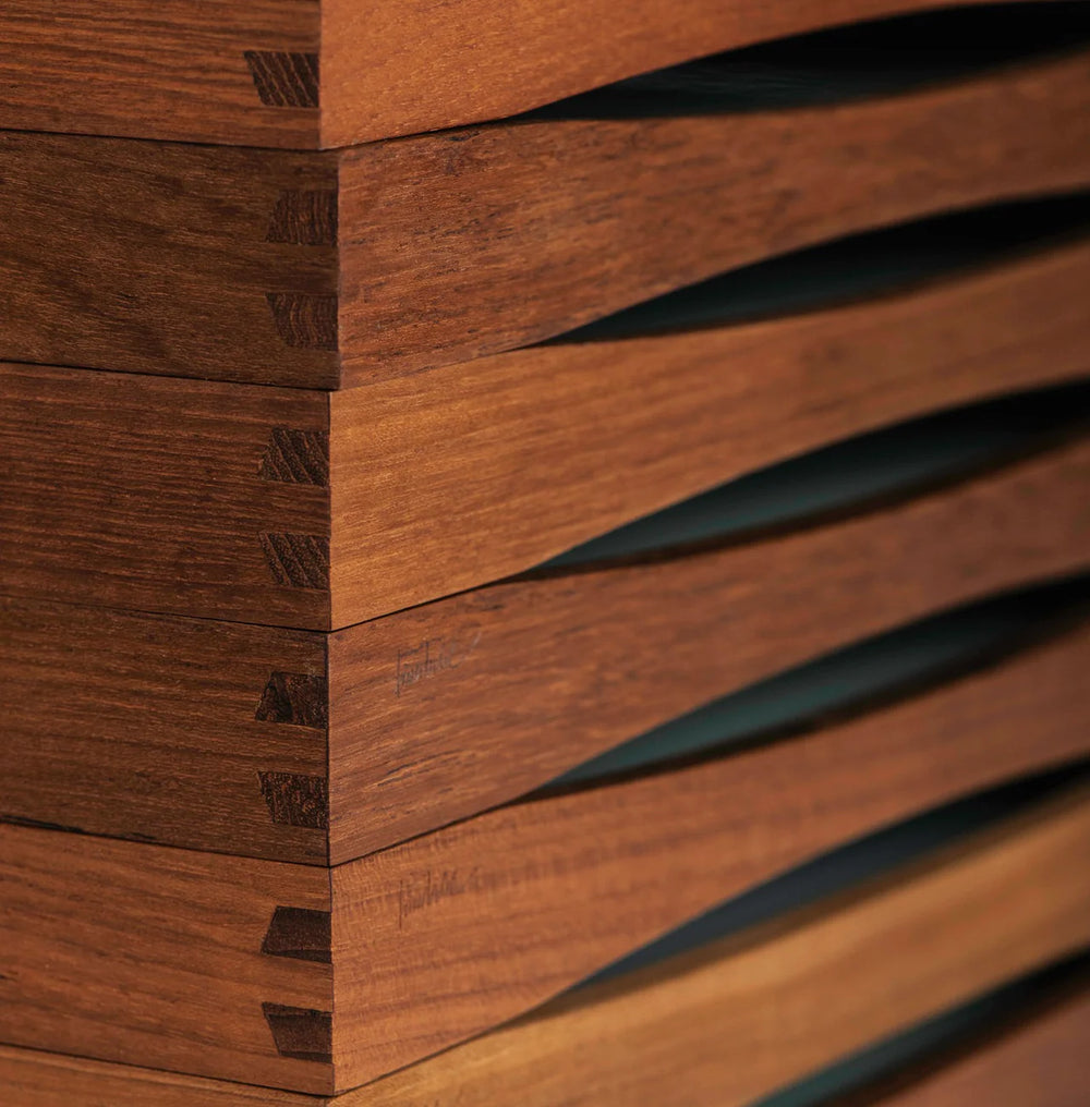 Turning Tray was designed in 1956 by Finn Juhl, bearing his trademark curved teak frame and precise corner joints. Made without handle bars, the tray’s curvature allows space to pick it up.