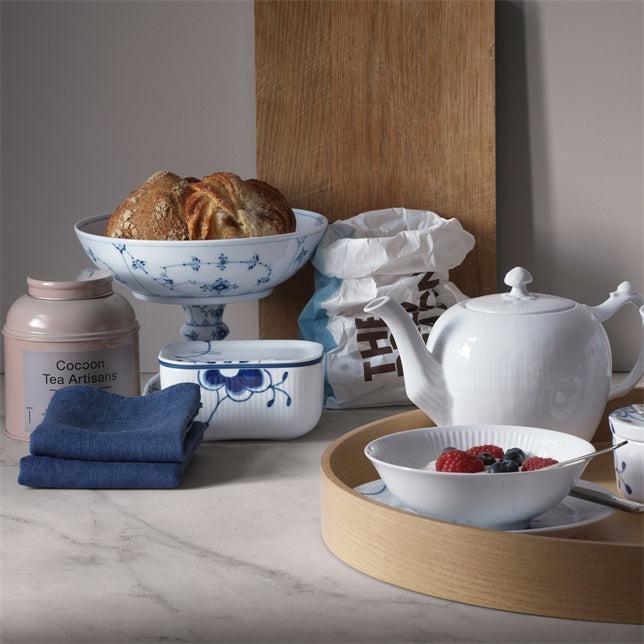 Smørkrukken med låg på 42 cl i Blå Mega Riflet er en helt særlig og iøjefaldende tilføjelse til bordet. Porcelænskrukken holder smørret koldt i længere tid, og silikonekanten omkring låget, som holder krukken lufttæt, er samtidig en kærlig hilsen til Blå Mega Riflet-mønsterets inspirationskilde, det musselmalede mønster. Blå Mega Riflet er på en gang velkendt og forfriskende. Stellet er født af en modig nyfortolkning af det ikoniske Musselmalet Riflet og fortryller med sine grafiske og forstørrede sektioner af det musselmalede mønster. Siden Blå Mega Riflet blev designet i 2000 er stellet vokset sig til en ny klassiker inden for dansk design, og det iøjnefaldende stel er smukt i sig selv og i kombination med særkollektionen Mega Rose eller andre Royal Copenhagen stel.