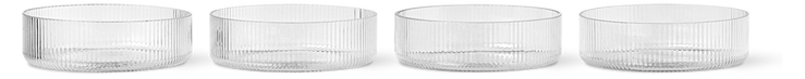 Ripple Serving Bowls er lavet af fint glas, der er blevet mundblæst i en kruset form, og er et sæt på fire skåle, der har samme særegne overflade, som kendetegner Ripple-serien. Brug sættet til at servere appetitvækkere som oliven, tapenader eller andre lækre snacks for dine gæster, eller til at præsentere dine kære for en lækker dessert.
