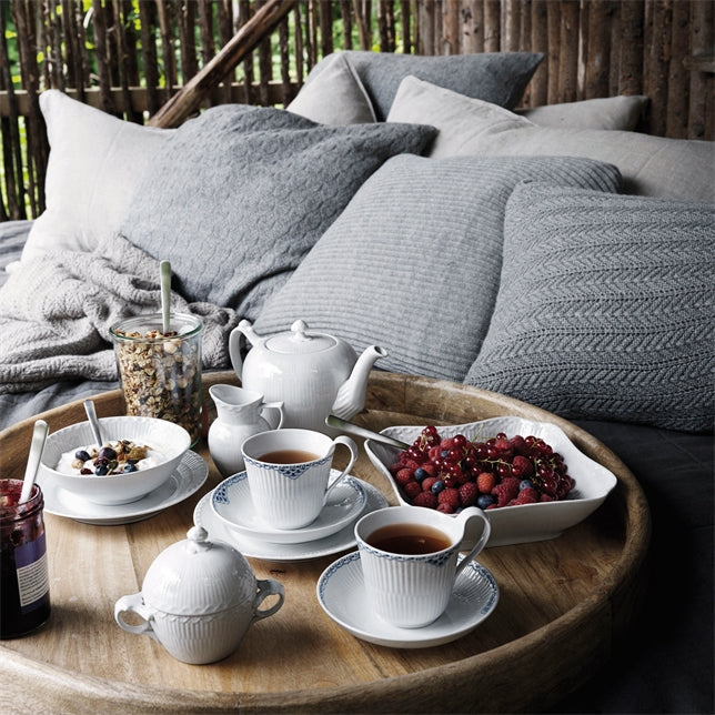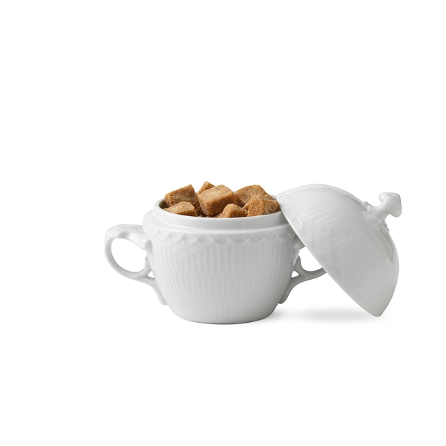 Den elegante symmetri skabt af de delikate hanke på denne bedårende Hvid Halvblonde Sukkerskål på 20 cl er indbegrebet af det klassiske stel, der kombinerer en enkel æstetik med et romantisk udtryk. Skålen prydes af to bånd af blonder, og på låget sidder et lille sneglehus, som er inspireret af det musselmalede stel. Hvid Halvblondes ubemalede overflade sætter det delikate porcelænshåndværk i centrum. Hver eneste steldel er glaseret i hånden og dekoreret med en halvblonde skabt af dygtige håndværkere gennem mere end 200 år. Smukt og yndefuldt.