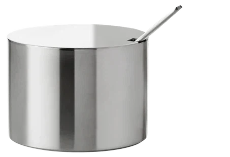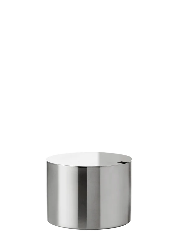 Arne Jacobsens sukkerskål i klassisk cylindrisk design. Sukkerskålens låg forhindrer, at der kommer støv i skålen, samt at skeen kan blive stående uden besvær. Den lille skål kan ligeledes anvendes til små snacks eller småkager. Som resten af Cylinda-line serien er sukkerskålen skabt i rustfrit stål.