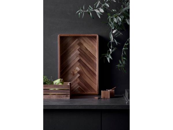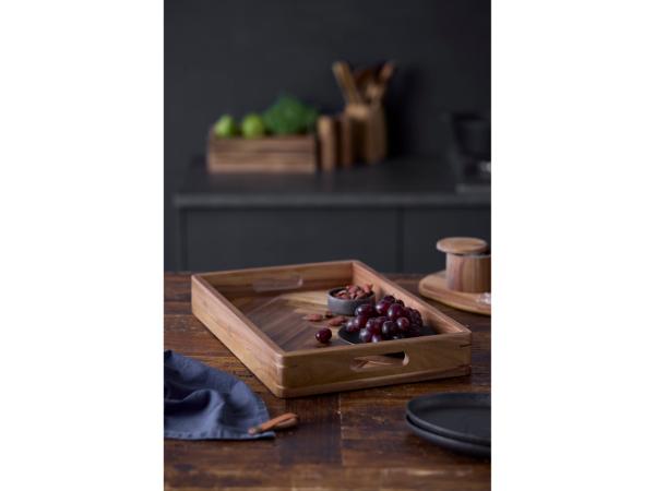 Flot bakke i akacietræ med elegant sildebensmønster. Den høje kant og de praktiske bærehåndtag gør bakken perfekt til flot servering af morgenmad, snacks eller drikkevarer. 40 x 30 cm.