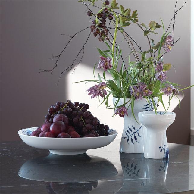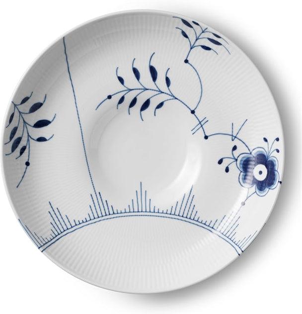 Det store fad på 34 cm i det håndmalede Blå Mega Riflet-mønster står på en lille søjlefod, der diskret hæver skålen over bordet. Skålen er smuk i sig selv, fyldt med frugt, eller som salatskål. En uundværlig tilføjelse til en samling af Blå Mega Riflet.