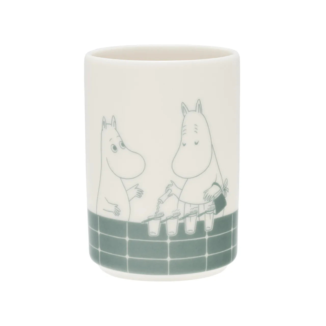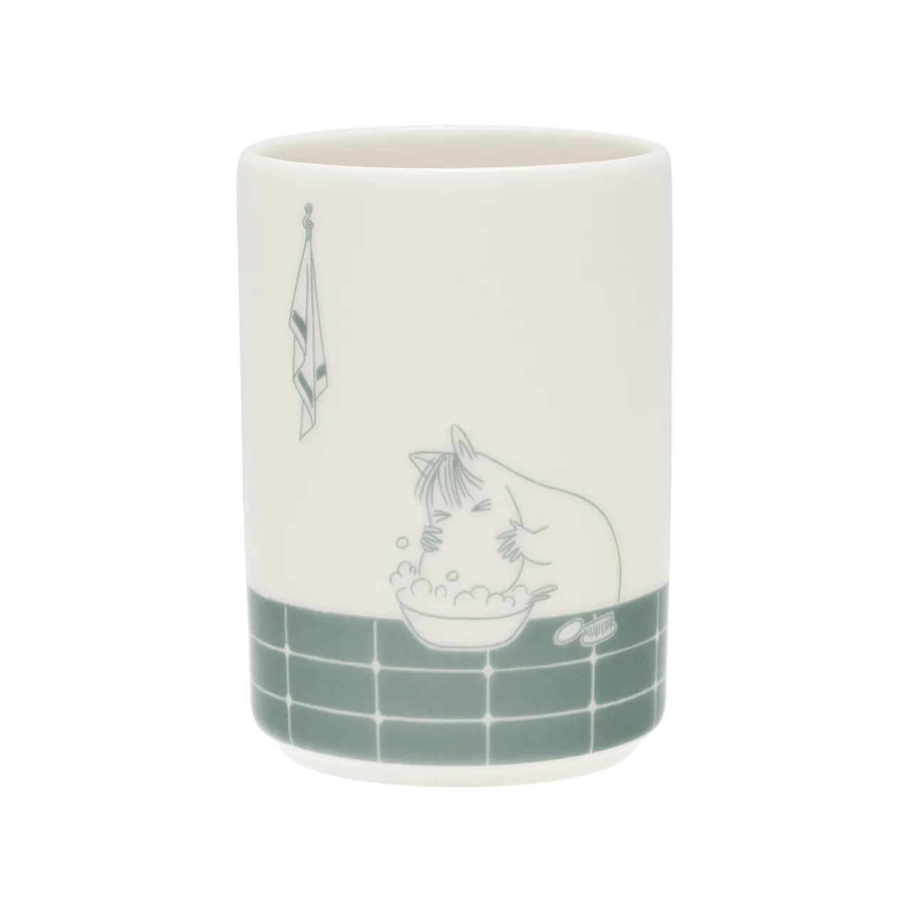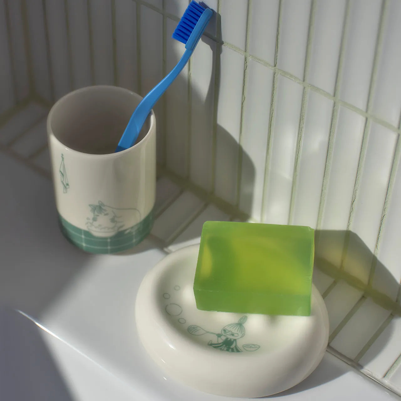 At vaske sig og børste tænder er et vigtigt ritual for Mumifamilien. Mens de forbereder sig på at gå i dvale, protesterer Mumitrolden, da han lige havde børstet tænder den morgen! De nye keramikbadeværelsesartikler er et dejligt supplement til Mumi-hjemmekollektionen.