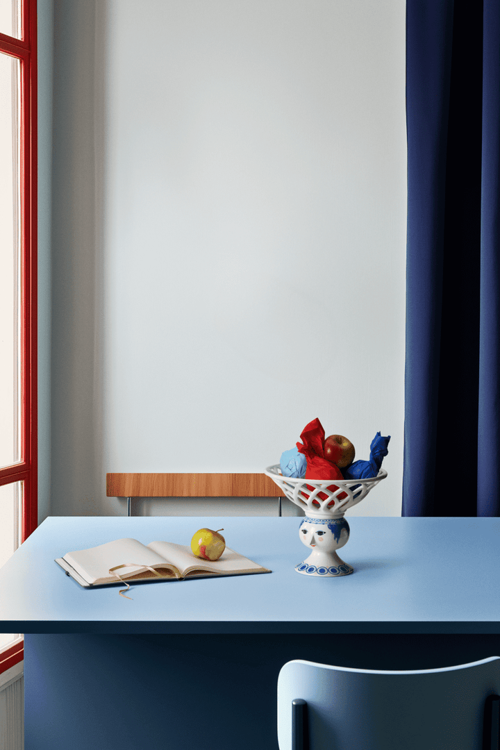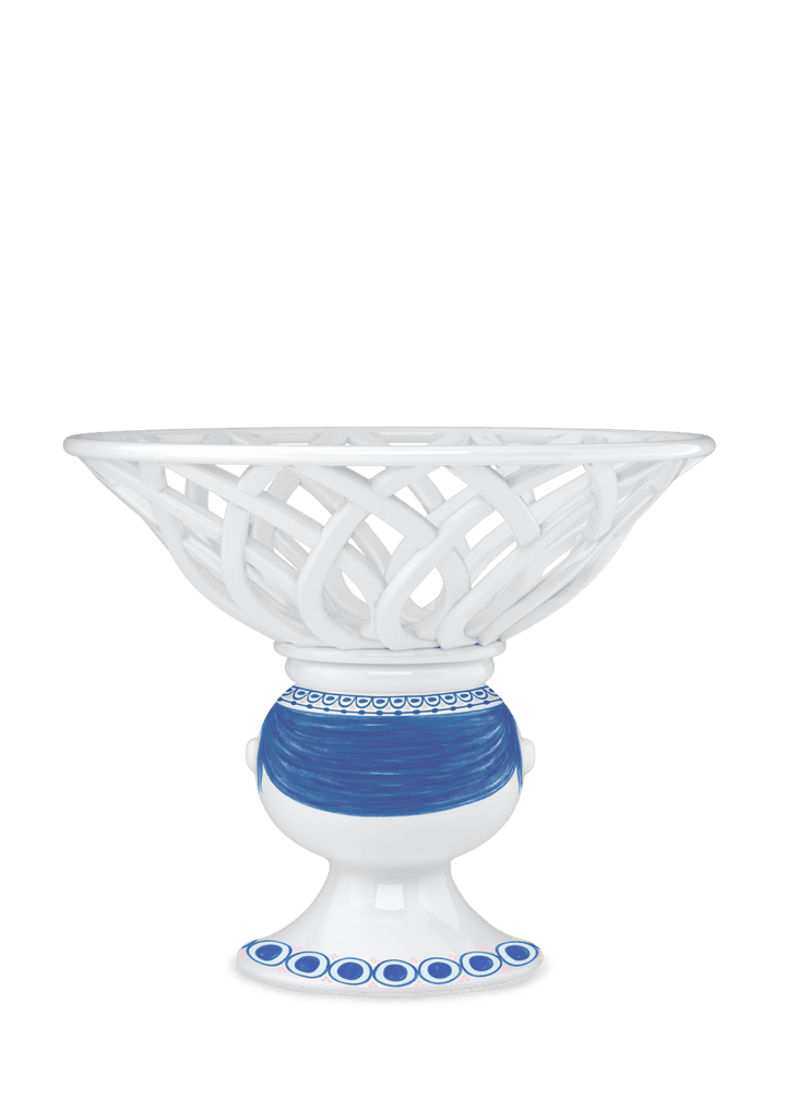 Bjørn Wiinblad repræsenterer alt, hvad der er skørt, skævt, kreativt og vidunderligt. Og med den smukke og smilende Dora-frugtskål fra Bjørn Wiinblad er du sikker på at få et ekstra festligt indslag i den legende boligindretning med et skørt, skævt, kreativt og vidunderligt udtryk hentet med udgangspunkt i Bjørn Wiinblads ikoniske designarv. Dora-frugtskålen måler 25 cm i diameter og er designet til at stå på en af hjemmets fremmeste pladser, hvor den vil skabe et unikt blikfang med sin karakteristiske flettede form i blankglaseret keramik dekoreret i en gennemgående blå farve med lyserøde detaljer på eksempelvis kinderne og den smukkeste lille rose i bunden af skålen – eller i toppen af hovedet. Du finder selvfølgelig også den ikoniske trekantede næse og de mandelformede øjne, mens finurlige cirkler og yndefulde prikker dekorerer hendes hals. Og går du helt tæt på, kan du også nyde Doras hårbånd dekoreret med en prikket stribe og en sød, bølget dekoration. Navnet Dora betyder gave på græsk. Så du kan sige, at Dora er født – eller i hvert fald døbt – til at blive givet i gave. Og det er helt op til dig, om hun skal skabe glæde hjemme hos dig selv eller hos en, du har kær. Du bestemmer også selv, om du vil lade hende pryde på køkkenbordet, invitere hende ind i på spisebordet eller lade hende trone på skænken. Uanset hvor du placerer Dora, vil hun skabe glæde i boligen med sine fine farver, finurlige detaljer og ikoniske dekorationer. Bjørn Wiinblad havde en forkærlighed for former og figurer, der var både skulpturelle og avantgarde. Og med Dora-frugtskålen, hvor Dora-figuren holder en kurv med en romantisk vævet effekt på hovedet, får du et unikt designikon med udtryksfulde dekorationer skabt med inspiration i Bjørn Wiinblads originale kunstværker. Glad og drømmende skaber Dora liv og personlighed i indretningen med sit poetiske udtryk og sine sprudlende farver.
