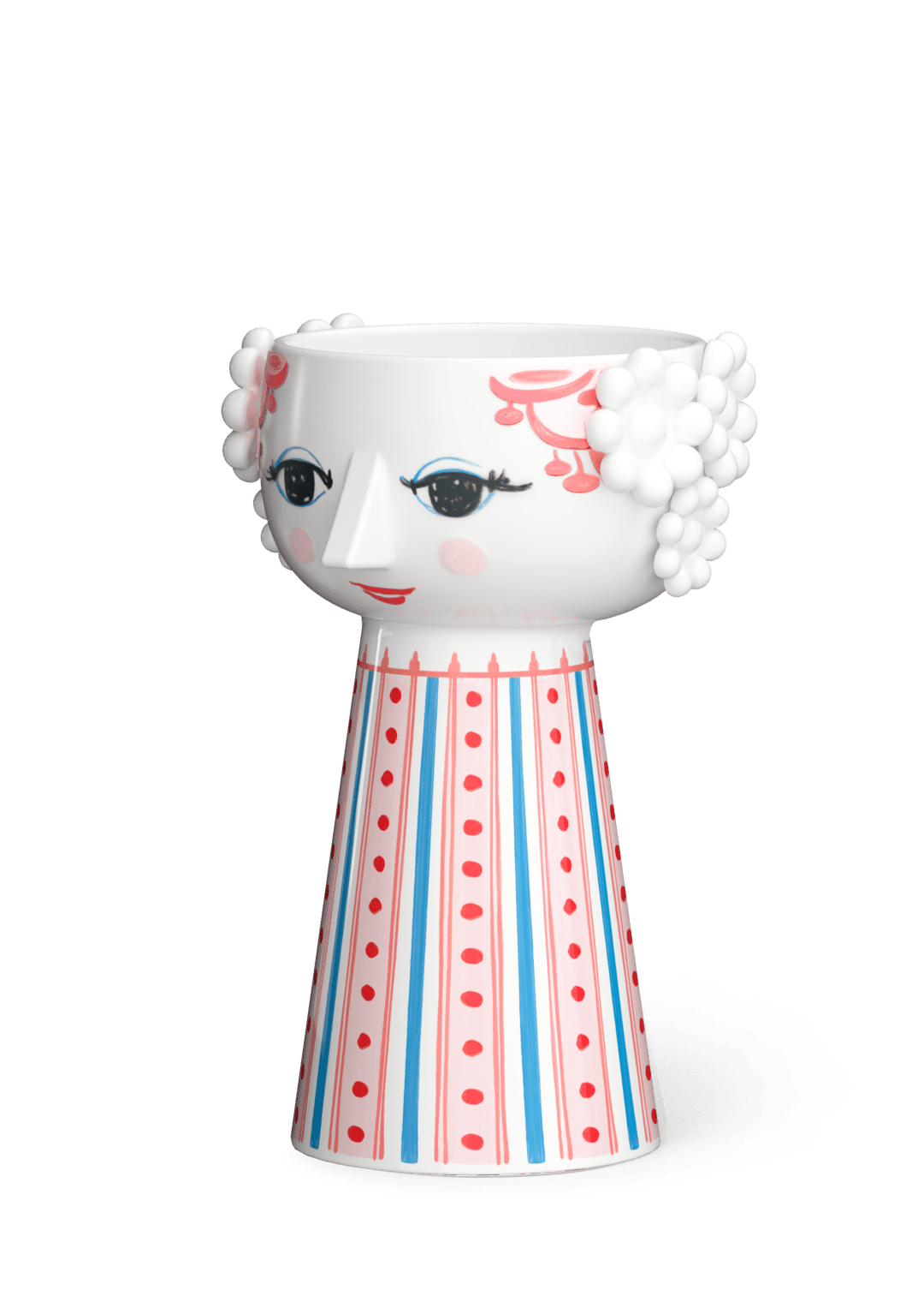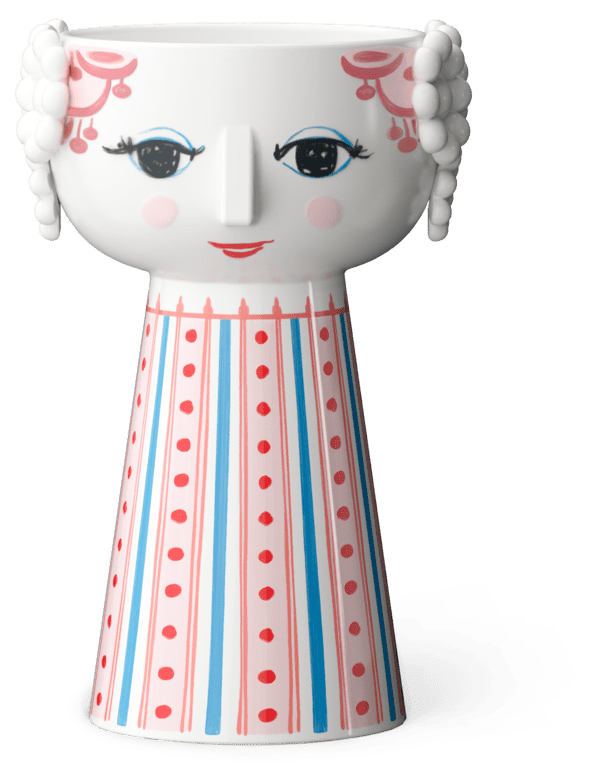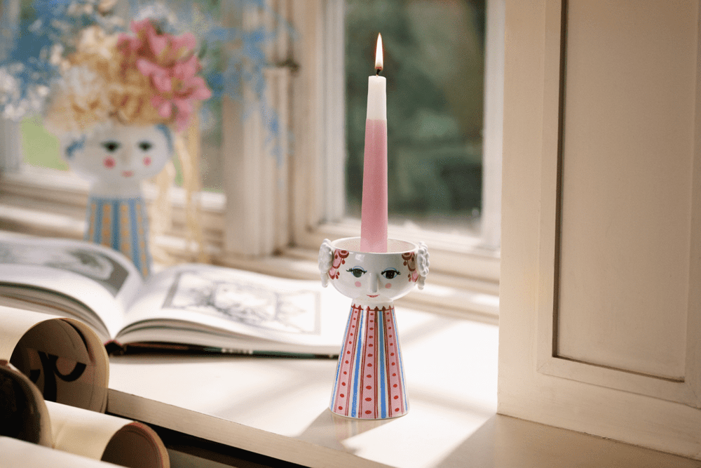 Udfold din farverige personlighed og lad kreativiteten lyse med Bjørn Wiinblads Eva. Med sit glade smil, de blussende kinder og farverige dekorationer rummer Eva på alle måder essensen af Bjørn Wiinblad som person og kunstner – også når hun tager form som lysestage. Glad og drømmende skaber hun liv og personlighed i indretningen med sit poetiske udtryk og sine sprudlende farver. Denne Eva-lysestage er 14 cm i højden og er holdt i farven støvet rød med detaljer i lyserøde, røde og blå nuancer, og når et tændt lys placeres i stagen, lyser den endnu mere op og gør hverdagen lidt mere farverig. Lysestagen er lavet af blankglaseret keramik med farvet decal og er inspireret af Bjørn Wiinblads originale Eva-univers, hvor brede hoveder med blomsterdekorationer og en kegleformet krop dannede grundstenene. Ansigtet med de mandelformede øjne og den spidse næse er Wiinblads oprindelige streg, og det farverige kjolemønster er en nyfortolkning af Bjørn Wiinblads illustrationer fra arkiverne.