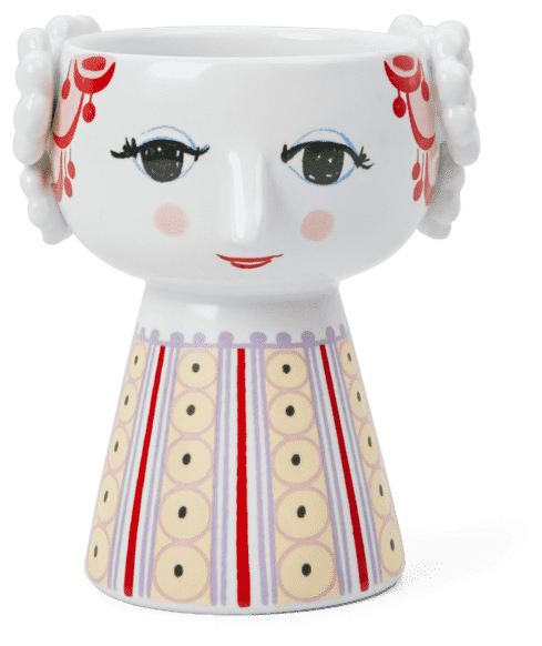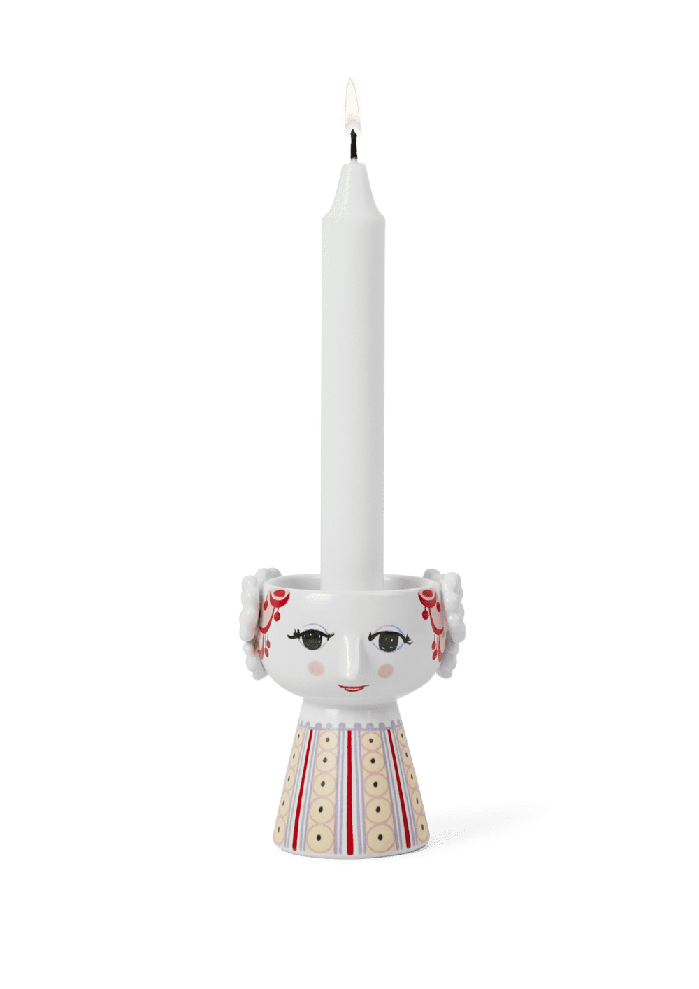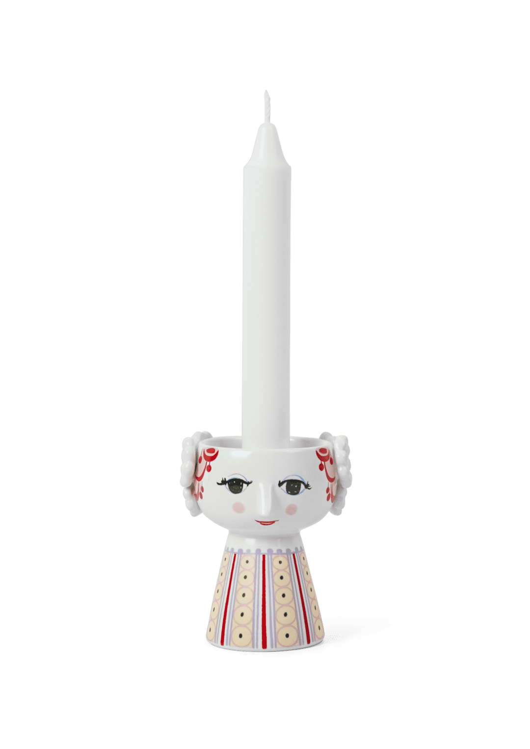 Bjørn Wiinblads stil er alt andet end minimalistisk. Den er overdådig, finurlig, vidunderlig – og stærkt defineret af levende farver og et unikt look. Du finder også mange af hans skæve og kunstneriske dekorationer på Eva-lysestagerne fra Bjørn Wiinblad. Designet er et sandt sammensurium af farver og geometriske former med en håndtegnet fornemmelse, der på en eller anden måde passer perfekt sammen. Og med denne smukke Eva-lysestage fra Bjørn Wiinblad med en dejlig lavendel nuance skaber du finurlighed i fuldt flor overalt i hjemmet. Lysestagen er 9,5 cm høj og har en diameter på 8 cm. Den er dekoreret med rødt hår og en farverig kjole i lavendel med lyserøde cirkler, grønne prikker og røde striber. Eva-lysestagen emmer af kærlighed til overdådighed og er perfekt til både fyrfadslys og stearinlys – eller helt alene som et lille skulpturelt indslag i indretningen. En Eva-lysestage pynter og skaber glæde både på bordet og på hylden, hvor den lyser op og gør hverdagen lidt mere farverig – præcis som Bjørn Wiinblad elskede det. Bjørn Wiinblad var en livsglad kunstner med en stor og farverig personlighed, der gik sine egne veje og ikke var bange for at drømme og tænke stort. Den sjæl mærkes også i Eva, der hviler i sig selv og inviterer os til at udtrykke vores egen stil og personlighed i indretningen. En ting er sikkert: Det bliver ikke kedeligt, når Eva flytter ind.