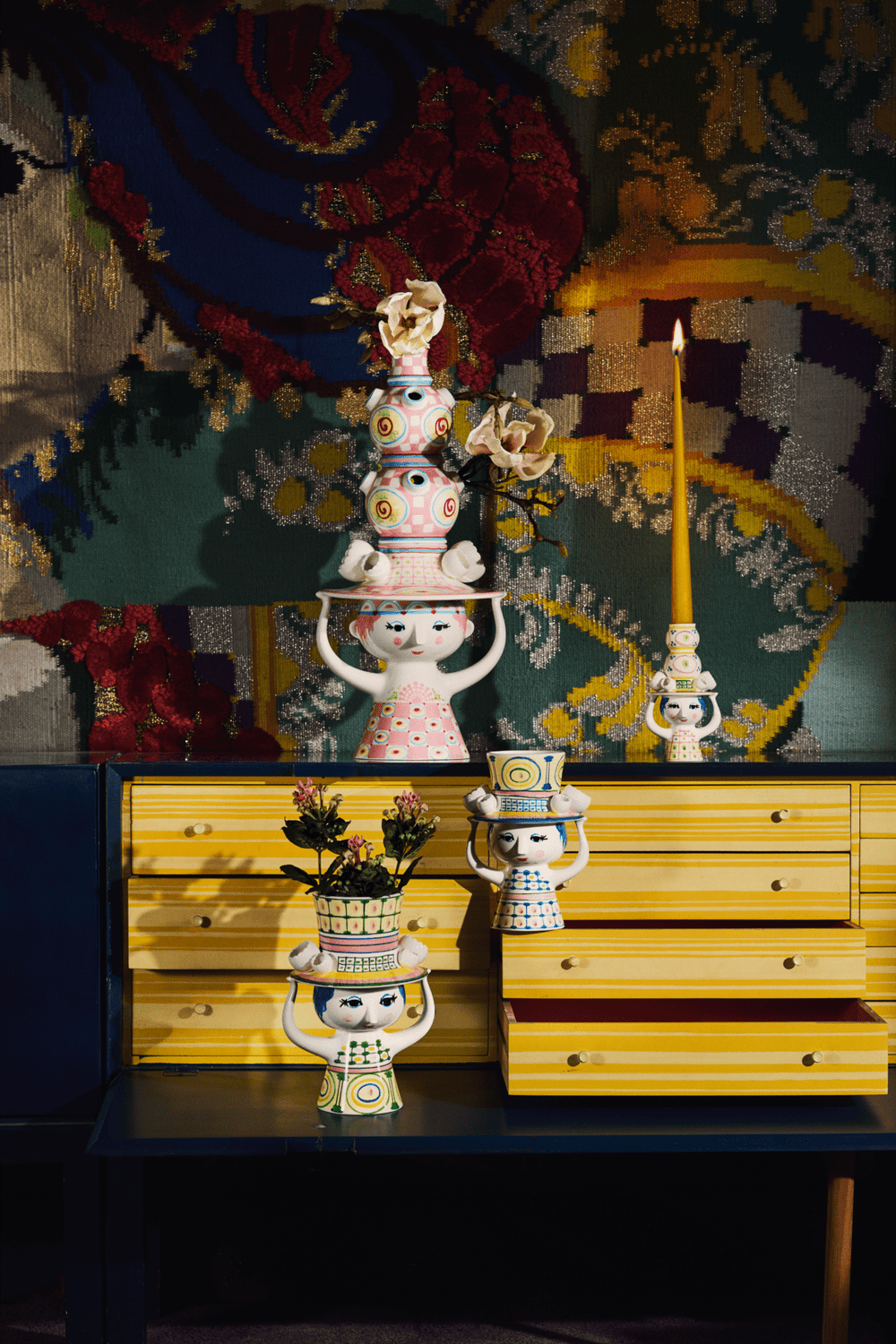 Invitér en rigtig Lady indenfor og lad hende skabe glæde i boligen med sine fine farver, finurlige detaljer og håndmalede dekorationer. Bjørn Wiinblad havde en forkærlighed for figurer med hatte, og arkiverne rummer utallige eksempler på, hvordan hatten dukker op igen og igen på nye, kreative og legende måder. Han designede selvfølgelig ikke små uanseelige pyntehatte. Nej, det var store voluminøse kreationer, der var både skulpturelle og avantgarde i deres udtryk – præcis som i serien Lady with hat. Og Bjørn Wiinblads univers bliver nok heller ikke meget mere magisk, fantasifuldt, fantastisk og overdådigt, end det er tilfældet med denne helt spektakulære vase i glaseret keramik. Den omfavner til fulde alt, hvad der er skørt, skævt, kreativt og vidunderligt i Bjørn Wiinblads verden. Vasen måler intet mindre end 50 cm i højden og er hånddekoreret fra top til tå med motiver inspireret af Bjørn Wiinblads mangfoldige arkiv. Og det er ikke bare én vase. Vasen består af to individuelle vaser, der både fungerer sammen og kan stå alene. Vasens base prydes af det ikoniske ansigt med den trekantede næse, de mandelformede øjne, rosenrøde kinder og det finurlige smil på læben. Med sine skulpturelle arme holder den håndmalede hattefrøken den store hat, der er udsmykket med yndige tulipaner formet i keramik på hver side. Kjolen er fuldt dekoreret med cirkler og striber i en frisk og dristig pink nuance, der er smukt afbalanceret i lysegule, lyseblå, grønne og røde toner – farver der bringer positivitet, varme og bidrager med masser af lysstyrke. Og går du lidt tættere på, vil du også finde de sødeste håndmalede roser og ternede mønstre med små åbninger i siderne, som dine yndlingsblomster kan falde yndefuldt ned i. I bunden af begge vasens dele ses den originale Bjørn Wiinblad-signatur og en tekst, der dokumenterer, at vasen er håndmalet – et bevis på at du er sikret dit helt eget unikke håndmalede designikon. Brug vasen til at give dine gæster en overdådig velkomst i entreen eller som et statement på skænken, i vindueskarmen eller på bordet.