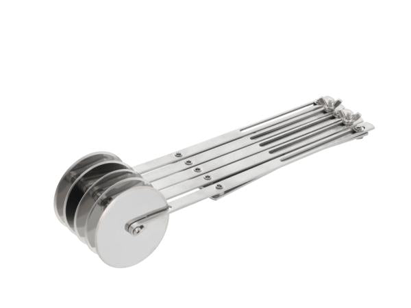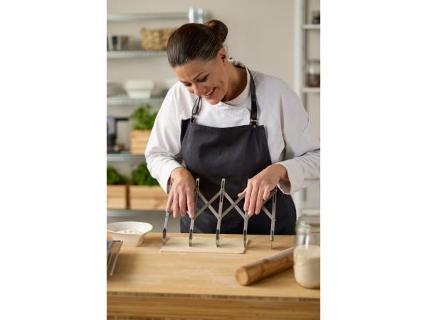 Denne dejspore gør det nemt skære dej med præcision og elegance. Den er udstyret med fem skarpe hjul i rustfrit stål hver med en diameter på 5,7 cm. Skærebredden kan justeres fra 1 cm til 11,5 cm, hvilket gør dejsporen velegnet til alt lige fra hjemmelavet pasta i ensartede strimler, som f.eks. fettuccine eller tagliatelle, til kager og andet bagværk, hvor dejen skal skæres i specifikke størrelser. Vaskes med varmt vand og sæbe før første brug. Håndopvask anbefales.