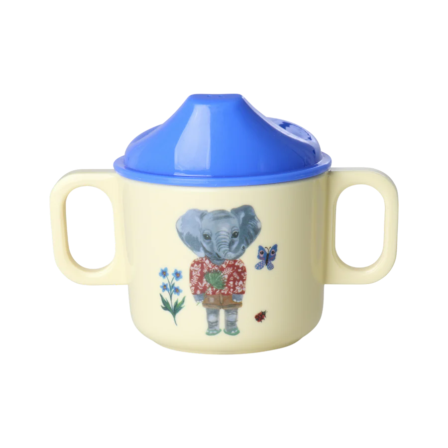 Praktisk babykop med et blåt låg og den sødeste elefant designet af den talentfulde franske kunstner Nathalie Lété. Koppen er lavet af melamin, hvilket er holdbart og ideelt til daglig brug på grund af dets styrke og lette rengøring. Det absorberer ikke farve eller smag fra maden – helt perfekt som en lille starterkop. Vær opmærksom på, at produktet ikke er egnet til mikroovn.