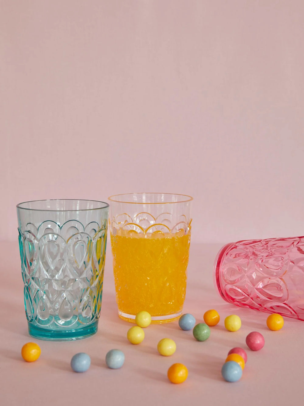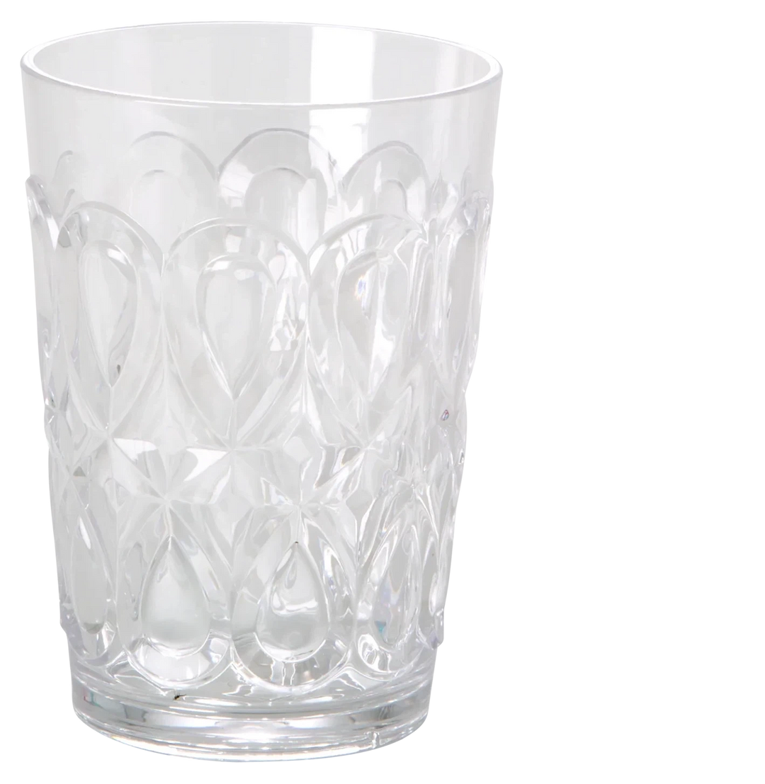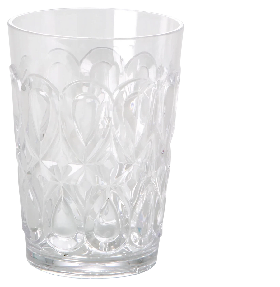 Stort retroinspireret drikkeglas i klar akryl, med hvirvlende flot facettering. Dekorativt og iøjnefaldende til enhver lejlighed og super praktisk både ude og inde. Mix med vores andre akrylglas eller de fine arvestykker fra vitrineskabet, og sæt dit eget helt unikke og personlige præg på bordopdækningen. Vores akrylmateriale tåler opvaskemaskine men for at bibeholde det smukke krystallook og længere levetid, anbefaler vi at du vasker dine akrylprodukter i hånden.