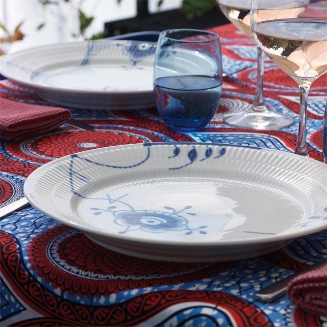 Denne Tallerken på 27 cm er både en smuk middagstallerken og et iøjefaldende serveringsfad. Den håndmalede Blå Mega Riflet Dekoration Nr. 6 er i sig selv et smukt element på bordet, og kan med fordel kombineres med tallerkener med Blå Mega Riflet Dekoration Nr. 2 eller dele fra andre Royal Copenhagen-stel for et personligt udtryk. Blå Mega Riflet er på en gang velkendt og forfriskende. Stellet er født af en modig nyfortolkning af det ikoniske Musselmalet Riflet og fortryller med sine grafiske og forstørrede sektioner af det musselmalede mønster. Siden Blå Mega Riflet blev designet i 2000 er stellet vokset sig til en ny klassiker inden for dansk design, og det iøjnefaldende stel er smukt i sig selv og i kombination med særkollektionen Mega Rose eller andre Royal Copenhagen stel.