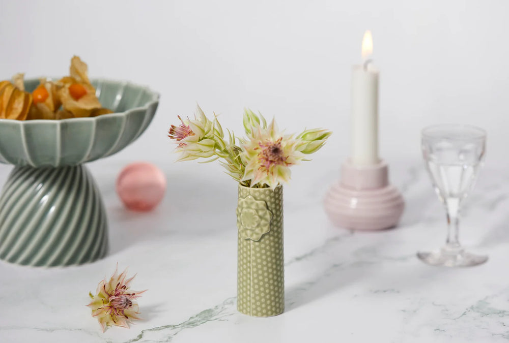 Vasen er perfekt til de små blomster, som børnene tit kommer ind med fra grøftekanten eller haven. De smukke glasurer og mønstre på Pipanella vaserne kan styles, så de passer ind i ethvert hjem. Miks mønstre og glasurer og lav dit eget stilleben.