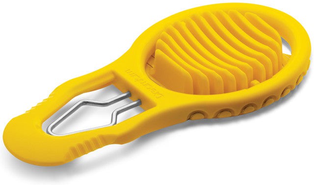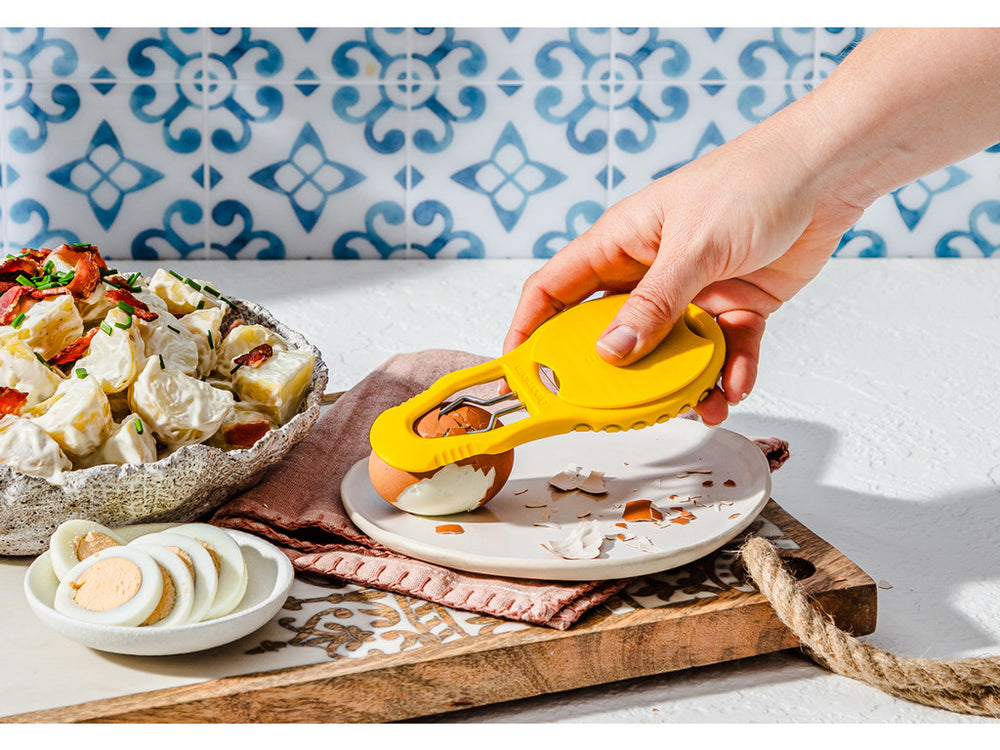 Eggler fra Dreamfarm er en æggedeler, der både kan knække, skrælle og skære hårdkogte æg i skiver. Et hurtigt tryk på Egglers riflede side skaber et rent brud i æggeskallen og et sted, hvor det spidse skrællehoved kan komme ind under æggeskallen. Egglers ydre form sørger for at holde skrællehovedet i rustfrit stål i den ideelle dybde, når den glider ind under æggeskallen for at adskille skallen fra ægget. Æggedeleren skaber nemt rene og jævne skiver til salater og sandwich. Leveres i et kompakt, slankt design og opbevares fladt i en skuffe. Materiale er polypropylene og rustfrit stål. BPA-fri. Tåler opvaskemaskine.