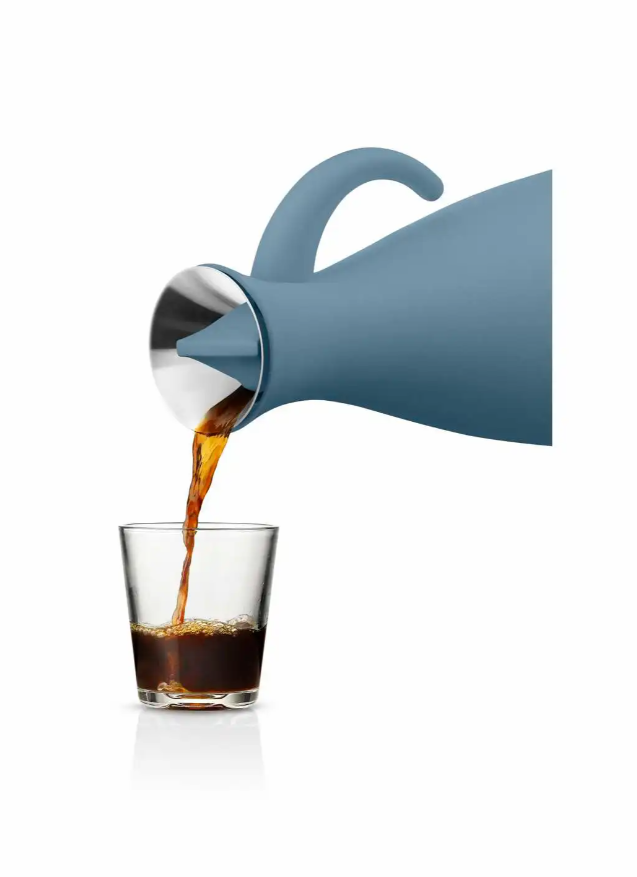 Det skulpturelle design bygger på det prisvindende koncept, der ved hjælp af en hældekrave i rustfrit stål gør termokanden 100% drypfri. Termokanden er med sin brede åbning i toppen nem at fylde, og det lave tyngdepunkt gør, at den står stabilt på bordet. Fremstillet i kunststof udvendigt, hældekrave af rustfrit stål og silikone og med en udskiftelig glaskolbe indvendigt. Indeholder 1 liter.