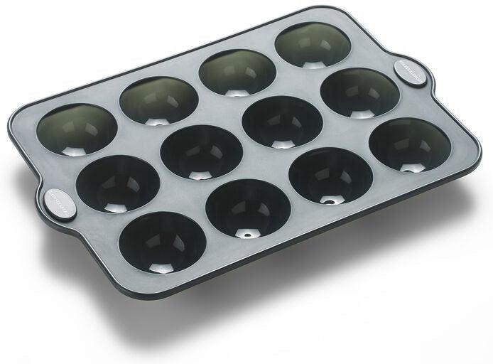 Chokolade-/buddingform med 12 huller, dia. 6,5 cm, i grå silikone med stabiliserende stålkant. Tåler fryser og temperatur fra - 20 til + 220 grader. Måler 35,9 x 24,5 x 3,5 cm.