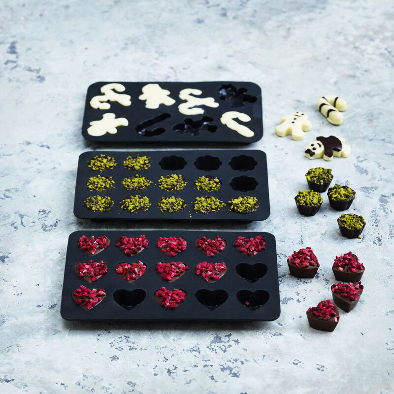 Chokoladeforme i grå silikone med 3 forskellige temaer, så du kan støbe de fineste, små chokoladefigurer. Formsættet giver 15 blomster, 15 hjerter og 8 søde julemotiver. Den bløde silikone gør det nemt at vende de støbte figurer ud af formene. Velegnet til opvaskemaskine og fryser ned til -20° C. 10,8 x 17,4 cm.