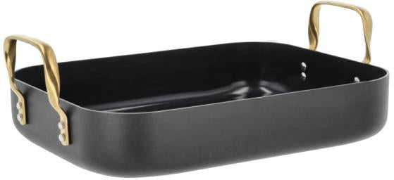 Brasserie-serien er fremstillet i aluminium. Bradepanden har keramisk belægning indvendigt, sort coating udenpå og mat messingfarvede håndtag. Tåler ovn op til 220 grader. Vi anbefaler at bruge redskaber i plast eller træ. Ikke egnet til opvaskemaskine. Vaskes med varmt vand og sæbe før første brug. Produceret uden PFAS.
