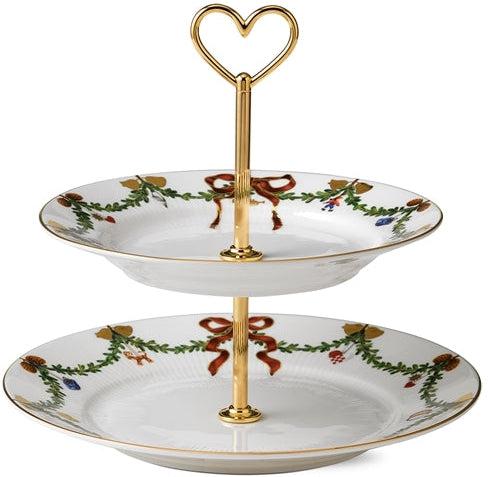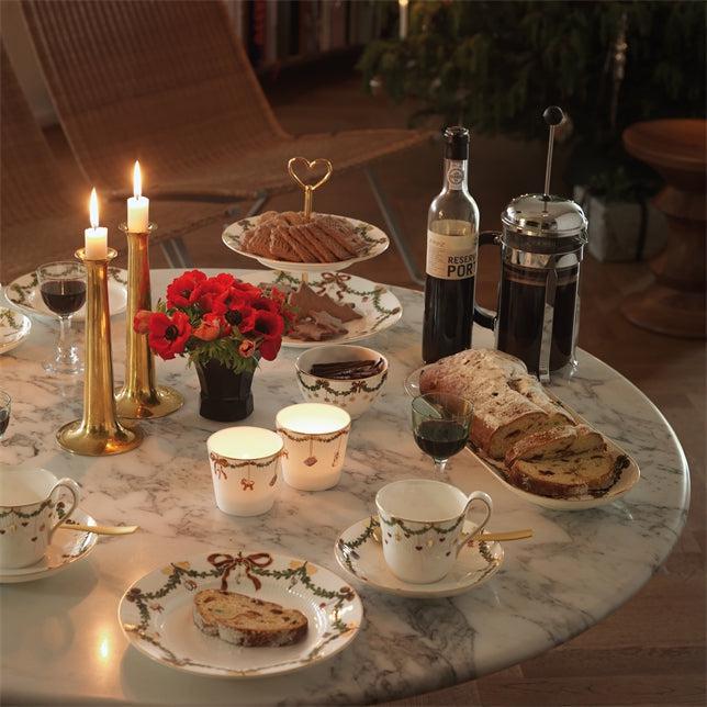 Når juledagene skal gøres ekstra magiske, er denne særlige étagére en ideel tilføjelse til kaffebordet. Opsatsen består af to lag, som hver især er dekoreret imed den elskelige dekoration fra Stjerne Riflet Jul, der med granguirlander og juleornamenter skaber en klassisk opdækning. Étagéren kan løftes med den hjerteformede hank, som tilføjer et strejf af juleromantik til denne fine steldel. Blandt julens smukke traditioner hører julestellet fra Royal Copenhagen. På tallerkener, skåle og kopper snor granguirlanderne sig højtideligt, dekoreret med elegante silkesløjfer og den fineste julepynt. Stjerne Riflet Jul skaber stemning og gør julen til noget helt særligt – generation efter generation. Hver eneste steldel er et smukt stykke julepynt i sig selv, og når bordet står dækket og lysene er tændt, så bliver det helt sikkert jul igen.
