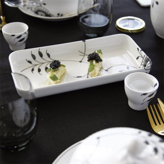 Dette rektangulære Sort Mega Riflet Fad på 24 cm er håndmalet med et mønster af sorte og grå elementer. Lad det monokrome udtryk være rammen om enkle anretninger af sprødt tilbehør eller tapas. Sort Mega Riflet er et smukt bevis på, at selv de mest klassiske traditioner kan tåle at blive udfordret – med skønhed som resultat. Stellets karakteristiske mønster af sorte og grå håndmalede nuancer indkapsler en dramatisk, monokrom kontrast til de hvide porcelænsoverflader. I Royal Copenhagens blå univers er Sort Mega Riflet et strejf af sofistikeret coolness.