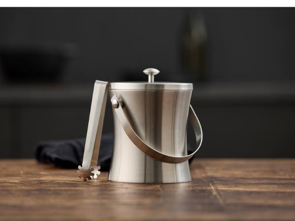 Funktionel isspand i blankpoleret rustfrit stål, med hank og integreret tang. Isspandens dobbeltvæg holder isterninger kolde, mens den aftagelige rist adskiller isterningerne fra det smeltede vand.