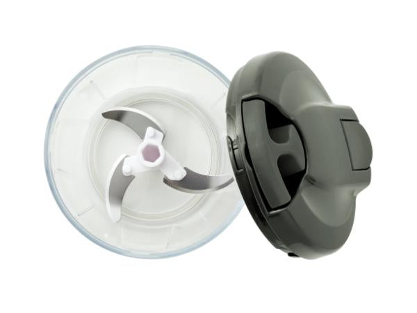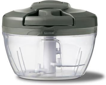 Minihakkeren med træksnor i låget er den hurtige løsning til at hakke og skære krydderurter, grøntsager, frugt, ost og meget andet. Beholder og låg er fremstillet i PP, de tre buede knivblade er af rustfrit stål.
