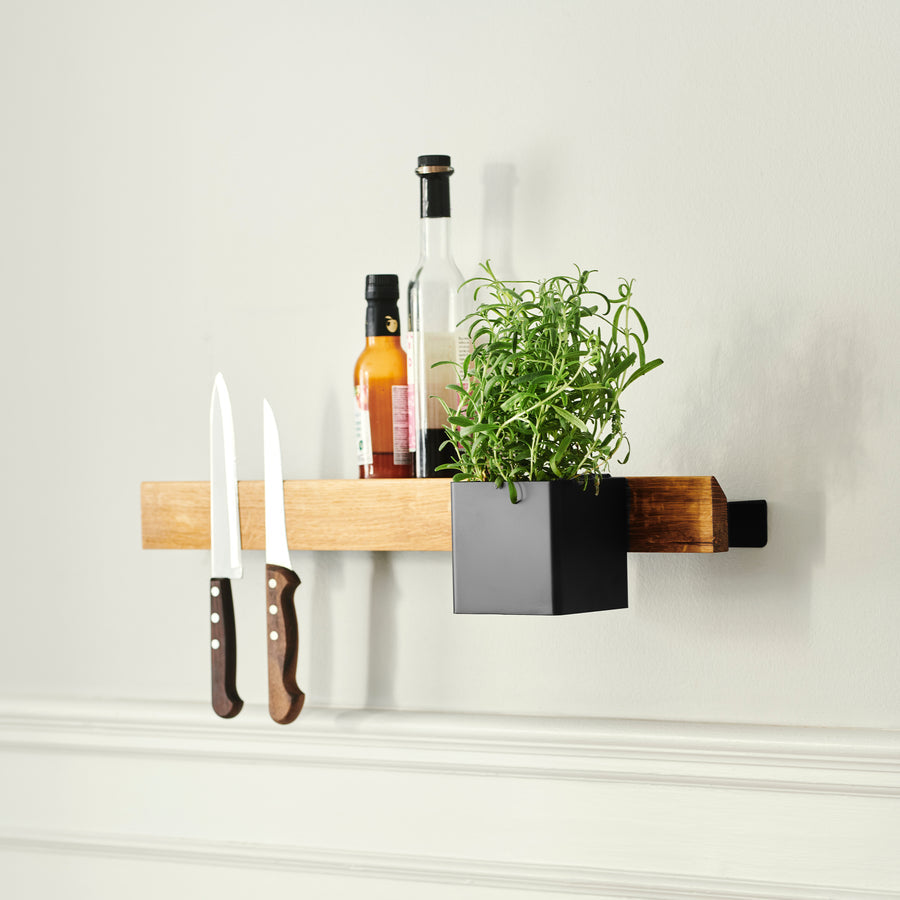 Brug den multifunktionelle hylde i køkkenet til krydderierne, som gallerihylde til dine flotte kogebøger, eller som knivholder. Kombiner fx hylderne med Flex boks til krydderurterne og Flex kaffefilterholder. Tilkøb Flex spejl og Flex knager, og brug Flex i entreen, hvor der fremover altid er styr på nøglerne, da de kan hænge direkte på hylden på grund af den kraftige magnet.