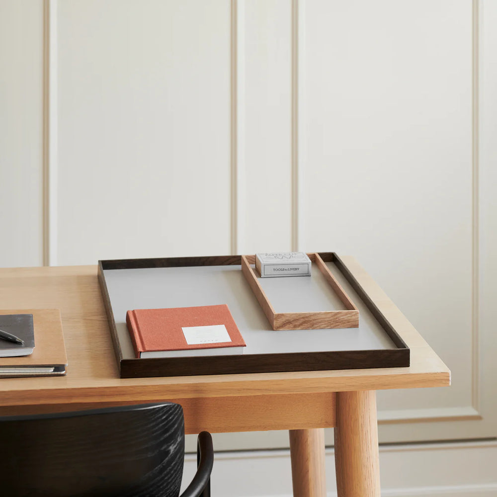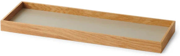 Frame er blevet genlanceret med tre nye farver, herunder en smuk grå, en forførende grøn og en elegant nude. For at tilføje endnu mere variation inkluderer kollektionen også muligheden for at vælge mellem en eksklusiv egetræskant og en i røget eg. De tre forskellige størrelser gør det muligt at vælge den ideelle Frame til ethvert behov, uanset om det er til udstilling af genstande eller som en praktisk serveringsbakke.