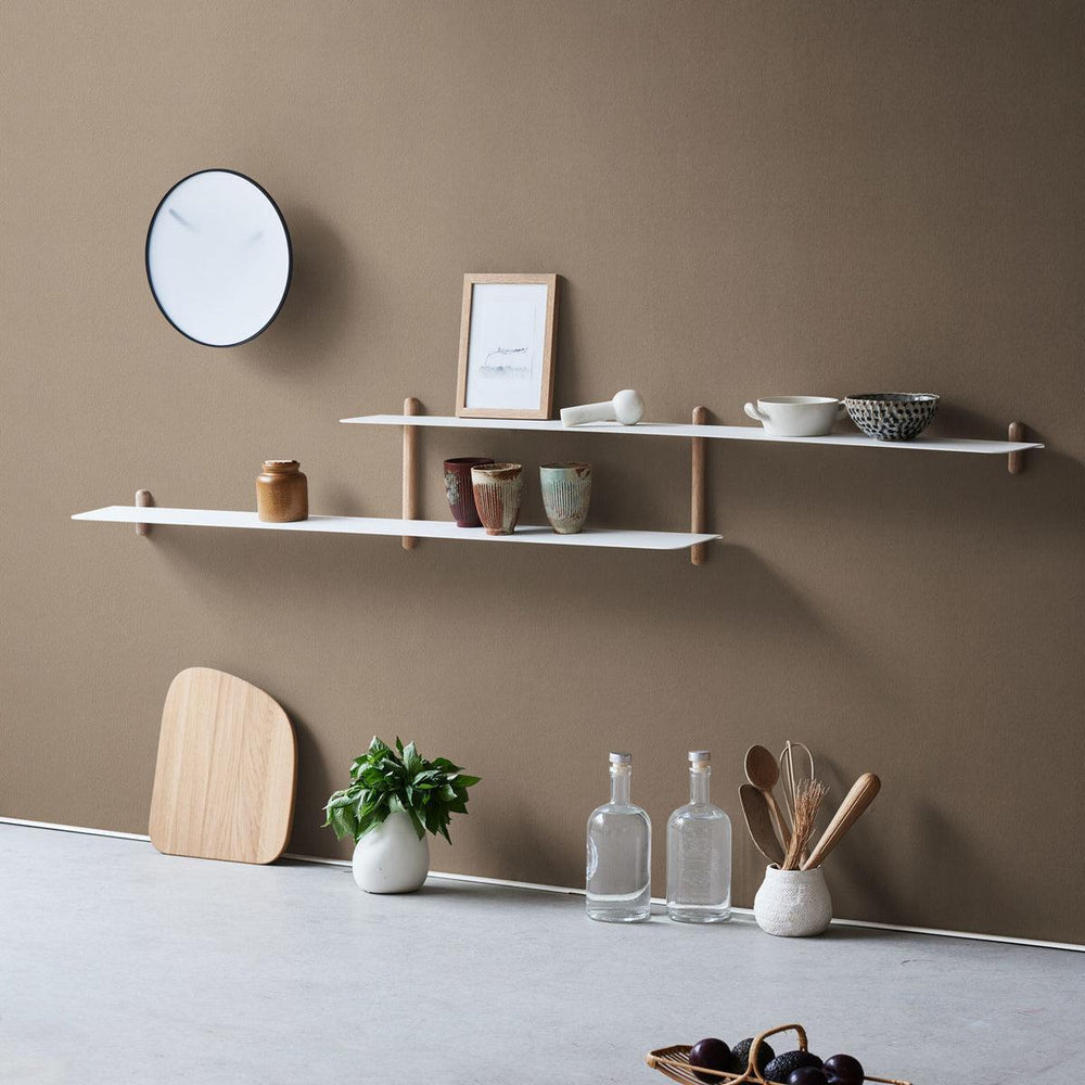 Nivo hylde stang og Nivo hylde kroge gør at Nivo hylden nu også kan bruges til at hænge eksempelvis viskestykker og gryder i køkkenet eller til håndklæder og tilbehør på badeværelset.
