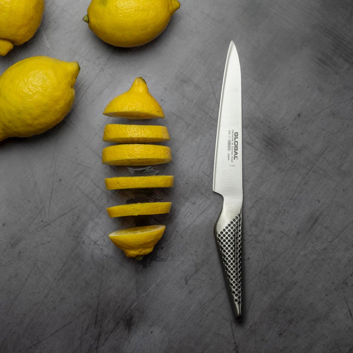Global, eller Global Classic, er den bredeste og mest kendte Global Series. Serien omfatter en række skarpe knivmodeller, lige fra kødøkser til fleksible filetknive, grøntsagshakkere og små skrælleknive. Knivene er fremstillet i et lag stål og kan genkendes på skaftet med de sorte prikker. Serien indeholder også redskaber og tilbehør, der hjælper dig med at holde dig skarp i køkkenet.