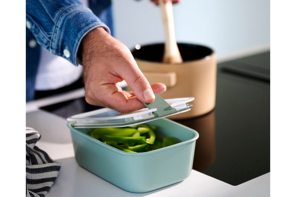 Opbevaringsboksen opfylder alle dine køkkenbehov. Med et enkelt klik lukker den tæt og lufttæt. Ideel til lækre dressinger eller en lille salat. Klik, forsegl og gem!