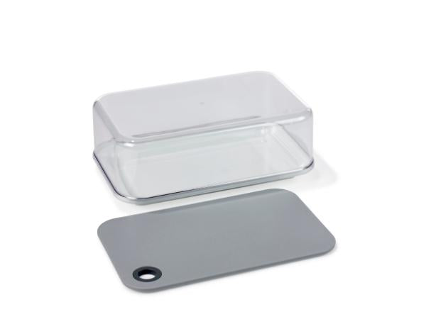 Mepal Modula osteklokke med skærebræt. Mål: 26 x 16 x 9,5 cm. Rumindhold: 3 liter. Mepal Modula modulboks hjælper dig med at få overblik i dit køkken! Det gennemsigtige låg giver overblik, når boksene placeres i køkkenskuffen. Boksen er fremstillet af SAN-plast, som er robust og modstandsdygtig overfor ridser. Velegnet til opvaskemaskine men ikke til mikroovn og fryser.