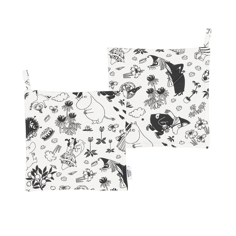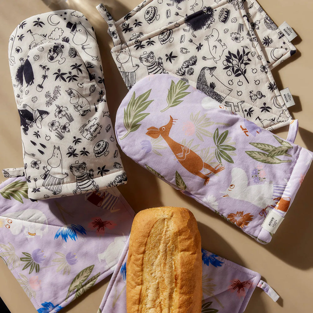 The Moomins are having a feast and it’s time to enjoy all sorts of delicacies! The Moomin kitchen textiles are fit for everyday as well as for celebrations and gatherings. The subtle toned black and beige pattern presents the familiar characters of Moominvalley.