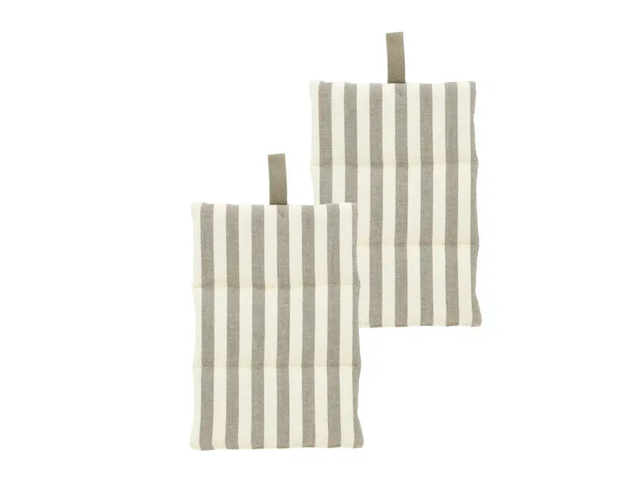 Klassisk og praktisk. Harmony-køkkenserien har et design, der aldrig går af mode, og fås i en ensfarvet udgave samt to stilfulde stribede mønstre. Serien er i genanvendt bomuld og passer ind i alle køkkener. Opgradér dit køkken med Harmony-serien, hvor tidløse produkter blandes med omtanke for miljøet. Den nye model af grydelapper i Harmony-serien er designet med fokus på minimalisme, med quiltning i form af blot to tværgående stikninger. Den rektangulære form gør dem praktiske og nemme at anvende. Grydelapperne og ovnhandskerne beskytter mod kontaktvarme ved 250 °C i maks. 15 sekunder.