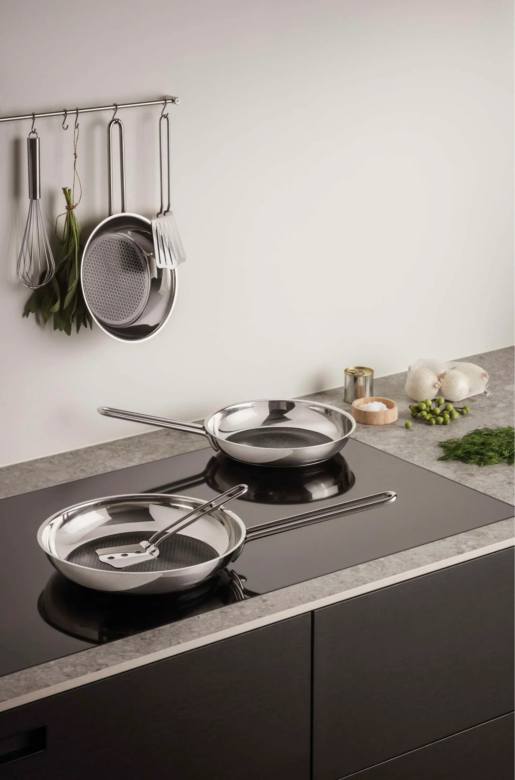 - Unikt mosaikmønster i overfladen, der kombinerer rustfrit stål og keramisk Slip-let®, forhindrer maden i at klæbe eller brænde fast.