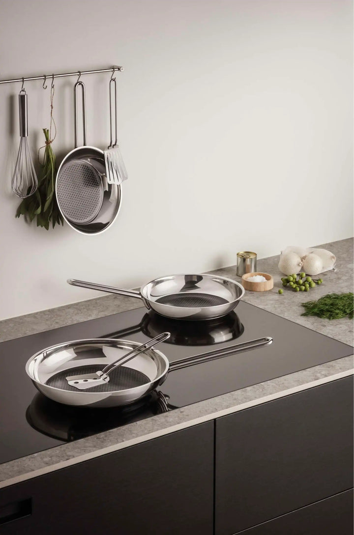 Unikt mosaikmønster i overfladen, der kombinerer rustfrit stål og keramisk Slip-let®, forhindrer maden i at klæbe eller brænde fast.