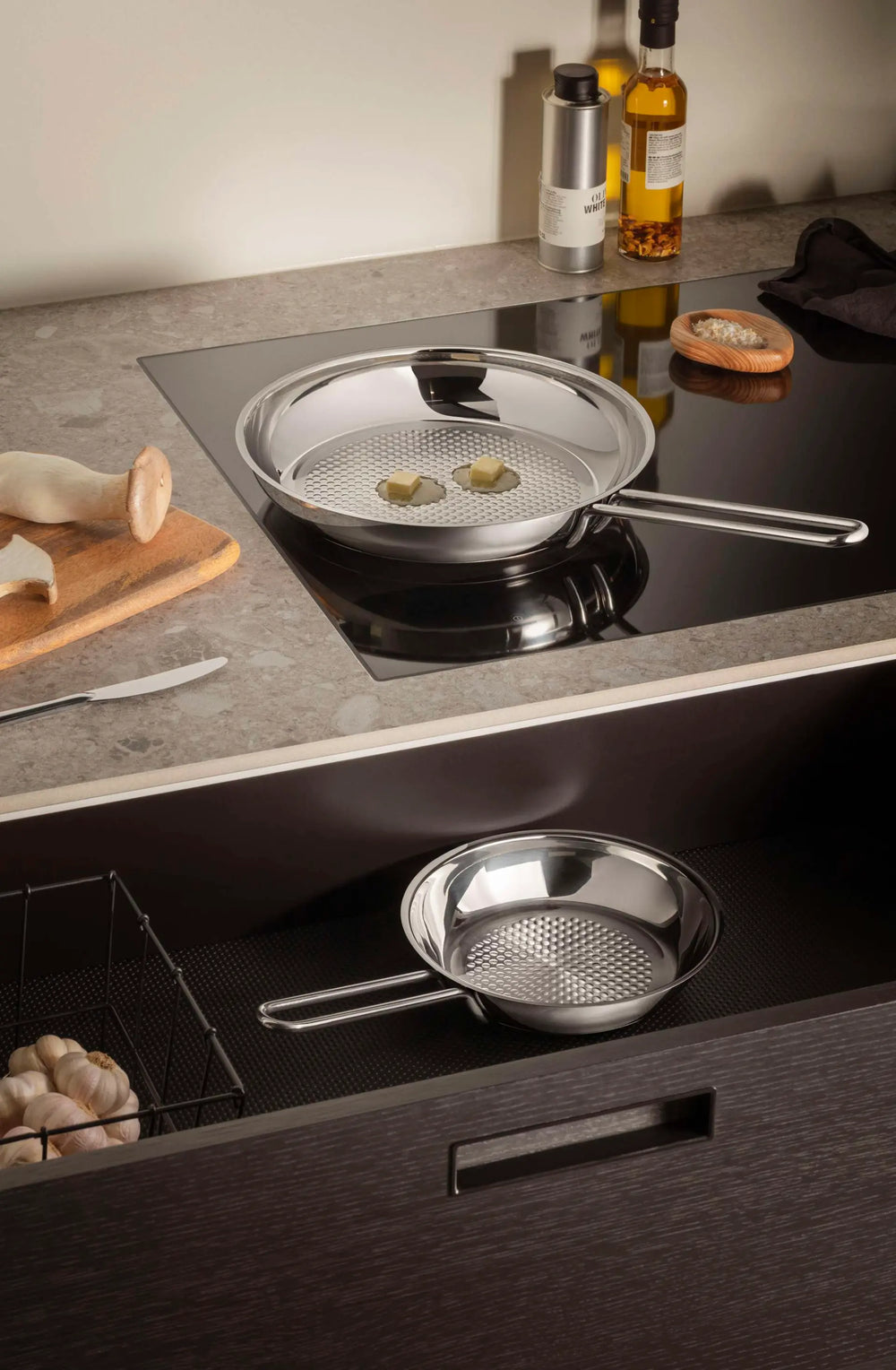 "Vaflet” bund fordeler fedtstoffet og danner en naturlig slippeevne, der mindsker chancen for at maden klæber og brænder på.