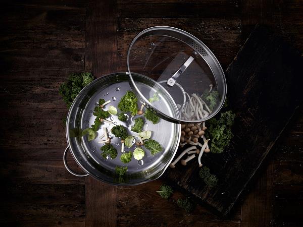 Glaslåg med si-funktion på to sider af låget, hvilket sikrer, at vand kan hældes fra gryden, uden at indhold kommer med.