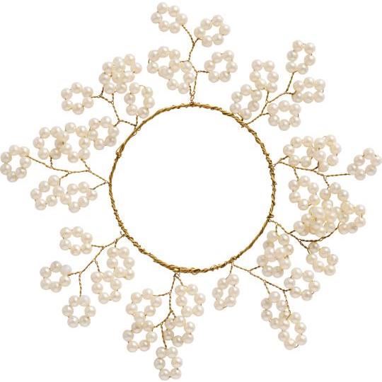 Håndlavet mini-krans lavet i metal med små hvide perler. Brug den som ophæng, servietring eller til dekoration på bordet.
