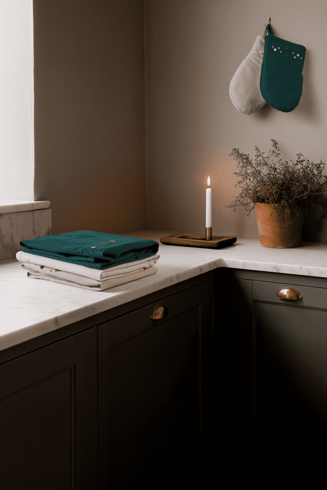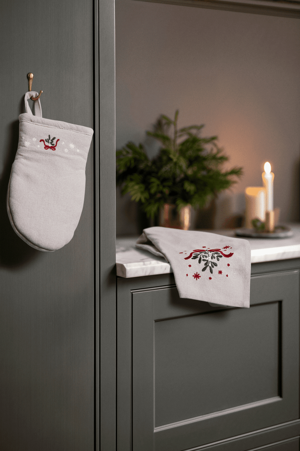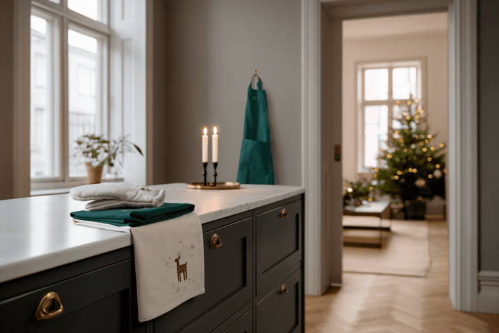 Mærk stemningen med JUNA Christmas Fable – magiske juletekstiler til alle rum. Juleeventyr, fantasi og humoristiske dekorationer med masser af cosy kant. Med JUNA Christmas Fable får du en serie af moderne tekstiler med broderede motiver, der både æstetisk og legende forankrer og fornyer julens helt særlige stemning gennem et magisk juleunivers fuld af traditioner, hygge og personlighed. Tænk på en komplet og fuldstændig gennemført julekollektion af certificerede tekstiler til både dit køkken og resten af hjemmet. De dekorative julesokker på trappen fyldt op med dagens kalendergaver. Duftene fra køkkenet, der blander sig med hjertevarme forventninger og kærlige minder om en hyggelig aften i stuen. Den ikoniske juleborddækning, der løfter stemningen og får både børn og voksne til at glædes sammen. Og forestil dig så det hele tilsat nærmest karikerede klassiske broderier, der fortæller endnu flere historier end de tråde, de er syet med. Tryllebunden misteltensmagi, skitseagtige juletræer, nuttede rensdyr, ikoniske julehjerter og fluffy julestjerner. Alle skabt med masser af glimt i øjet i en sød og bevidst naivistisk stil, der ikke kan undgå at sende dit julehumør helt op til den skønneste stjernehimmel. JUNA Christmas Fable er skabt til at samle os omkring bordet, i køkkenet – og også trække julestemningen med helt ind på puden, inden vi rammer drømmeland. Fuld af små broderede detaljer. Spækket med de helt store julefølelser. Denne fortryllende JUNA Christmas Fable- ovnhandske i en klassisk sandfarve er dekoreret med et broderet motiv af seriens mistelten, der omgivet af de yndigste små julestjerner smukt og stilfuldt pryder ovnhandskens nederste del. Den CE-mærkede JUNA Christmas Fable-ovnhandske måler 25 cm i længden og kommer med en yderside og en matchende strop i et skønt tekstilmix, hvor GRS-certificeret genanvendt bomuld bliver spundet sammen med polyester for en flot og funktionel stofkvalitet med både blødhed og slidstyrke, mens den indvendige fyldning er i 100% GRS-certificeret genanvendt polyester. JUNA Christmas Fable-serien giver dig et bredt udvalg af certificerede juletekstiler til hele hjemmet, hvor du mærker julestemningen i hver eneste tråd, og som du kan glæde dig til at finde frem jul efter jul. En kærlighedserklæring til godt håndværk og dekorativt dansk design vævet sammen af store eventyr og små broderede detaljer – skabt til at holde længe og blive elsket endnu længere. (GRS Certified by Control Union, 1026087)