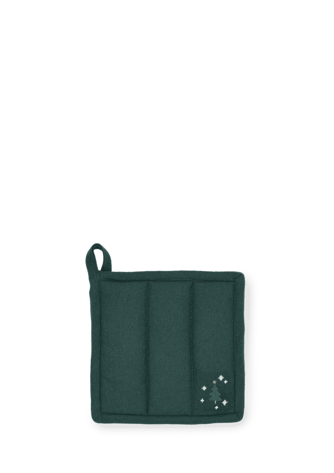Mærk stemningen med JUNA Christmas Fable – magiske juletekstiler til alle rum. Juleeventyr, fantasi og humoristiske dekorationer med masser af cosy kant. Med JUNA Christmas Fable får du en serie af moderne tekstiler med broderede motiver, der både æstetisk og legende forankrer og fornyer julens helt særlige stemning gennem et magisk juleunivers fuld af traditioner, hygge og personlighed. Tænk på en komplet og fuldstændig gennemført julekollektion af certificerede tekstiler til både dit køkken og resten af hjemmet. De dekorative julesokker på trappen fyldt op med dagens kalendergaver. Duftene fra køkkenet, der blander sig med hjertevarme forventninger og kærlige minder om en hyggelig aften i stuen. Den ikoniske juleborddækning, der løfter stemningen og får både børn og voksne til at glædes sammen. Og forestil dig så det hele tilsat nærmest karikerede klassiske broderier, der fortæller endnu flere historier end de tråde, de er syet med. Tryllebunden misteltensmagi, skitseagtige juletræer, nuttede rensdyr, ikoniske julehjerter og fluffy julestjerner. Alle skabt med masser af glimt i øjet i en sød og bevidst naivistisk stil, der ikke kan undgå at sende dit julehumør helt op til den skønneste stjernehimmel. JUNA Christmas Fable er skabt til at samle os omkring bordet, i køkkenet – og også trække julestemningen med helt ind på puden, inden vi rammer drømmeland. Fuld af små broderede detaljer. Spækket med de helt store julefølelser. Denne fortryllende JUNA Christmas Fable-grydelap i en dyb julegrøn farve er dekoreret med et broderet motiv af seriens juletræ, der omgivet af de yndigste små julestjerner i hvid smukt og stilfuldt pryder grydelappens nederste højre hjørne. Den CE-mærkede JUNA Christmas Fable-grydelap måler 22x22 cm og kommer med en yderside og en matchende strop i et skønt tekstilmix, hvor GRS-certificeret genanvendt bomuld bliver spundet sammen med polyester for en flot og funktionel stofkvalitet med både blødhed og slidstyrke, mens den indvendige fyldning er i 100% GRS-certificeret genanvendt polyester. JUNA Christmas Fable-serien giver dig et bredt udvalg af certificerede juletekstiler til hele hjemmet, hvor du mærker julestemningen i hver eneste tråd, og som du kan glæde dig til at finde frem jul efter jul. En kærlighedserklæring til godt håndværk og dekorativt dansk design vævet sammen af store eventyr og små broderede detaljer – skabt til at holde længe og blive elsket endnu længere. (GRS Certified by Control Union, 1026087)