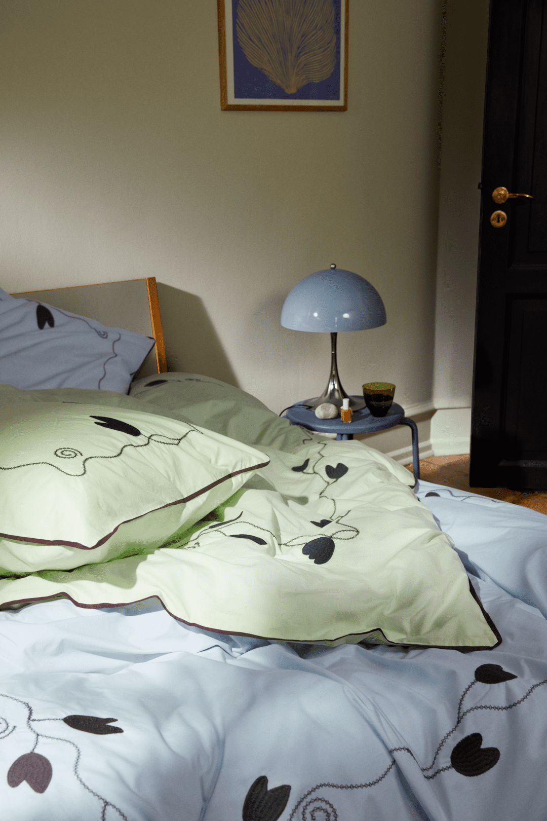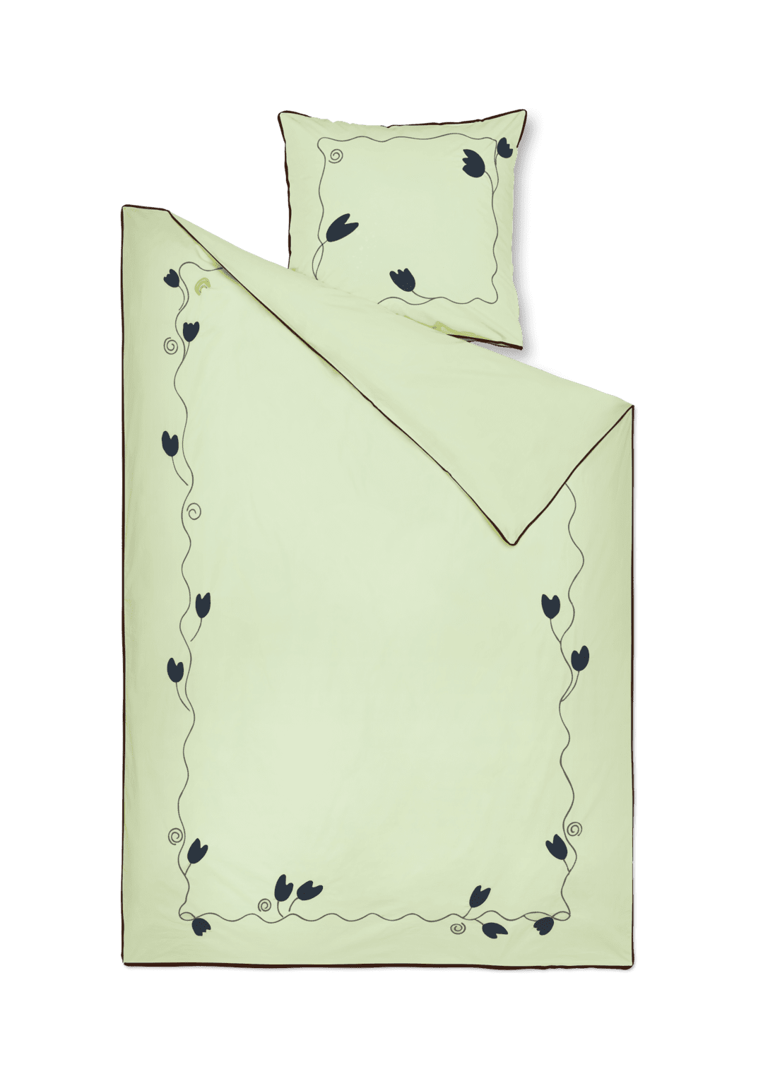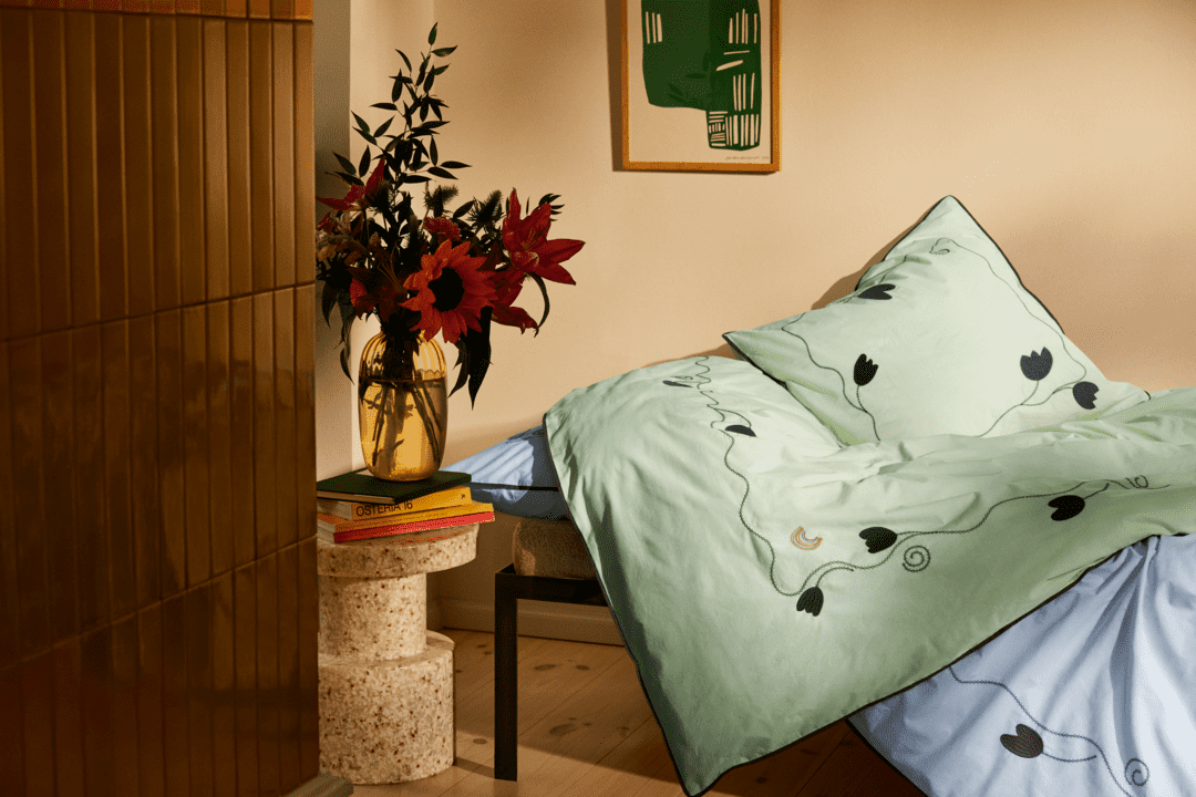 Mærk stemningen af bølgede blomsterranker i et opfriskende og trendy farveskema med masser af moderne kant. Med designsamarbejdet JUNA X KIMPOP fortolker de farverige personligheder Sofie Linde og Joakim Ingversen JUNAs drømmende univers i deres farverige, legende og unikke stil under navnet KIMPOP. Og med sengetøjet i Lollipop-kollektionen får du et fantastisk flow af broderede blomsterranker, der smukt og drømmende bølger sig ned over både pudebetræk og dynebetræk for en farvestrålende og fantasifuld stemning i soveværelset, i sofaen, i lænestolen, på din daybed, eller hvor du ellers hygger dig med din dyne og pude. Præcis ligesom JUNA ønsker Sofie Linde og Joakim Ingversen at skabe en hyggelig og uhøjtidelig følelse med deres tekstildesign, der inspirerer til store drømme i farverige omgivelser. Dette sengesæt til dyner med ekstra længde måler 140x220 cm og kommer i en sart lysegrøn prydet med broderede blomsterranker i mørkegrøn – en både sofistikeret og sensuel farvekombination, der forstærkes af den fremtrædende piping hele vejen rundt langs kanten i en trendy bordeaux farve. Og du bliver selvfølgelig heller ikke snydt for Lollipops signaturregnbue, som du finder broderet i sin mangfoldige skønhed øverst til venstre på dynebetrækket. Lollipop-sengetøjet er fremstillet i 100% økologisk bomuld, der er GOTS-certificeret, så du lunt og trygt kan nyde en god nats søvn, og når du kommer helt tæt på, vil du ud over detaljerne med blomsterrankerne også virkelig kunne se og mærke lækkerheden i den tætte og fine bomuldspercale, der giver stoffet en blød og glat tekstur. Samtidig med at være ekstremt behagelig at sove i får du med percalevævningen også et meget slidstærkt og holdbart sengesæt i en eksklusiv kvalitet, som du kan have glæde af nat efter nat – og år efter år. Pudebetrækket har kuvertlukning, mens dynebetrækket lukkes med knapper. Har du flere forskellige Lollipop-sengesæt fra JUNA, kan du lege med at blande de forskellige farver for at skabe lige præcis den følelse af cosy cocooning, der passer til dig og dit soveværelse. Med Lollipop og JUNA kan du gøre lige, hvad du drømmer om. (GOTS ”Organic” Certified by Control Union, 1026087)