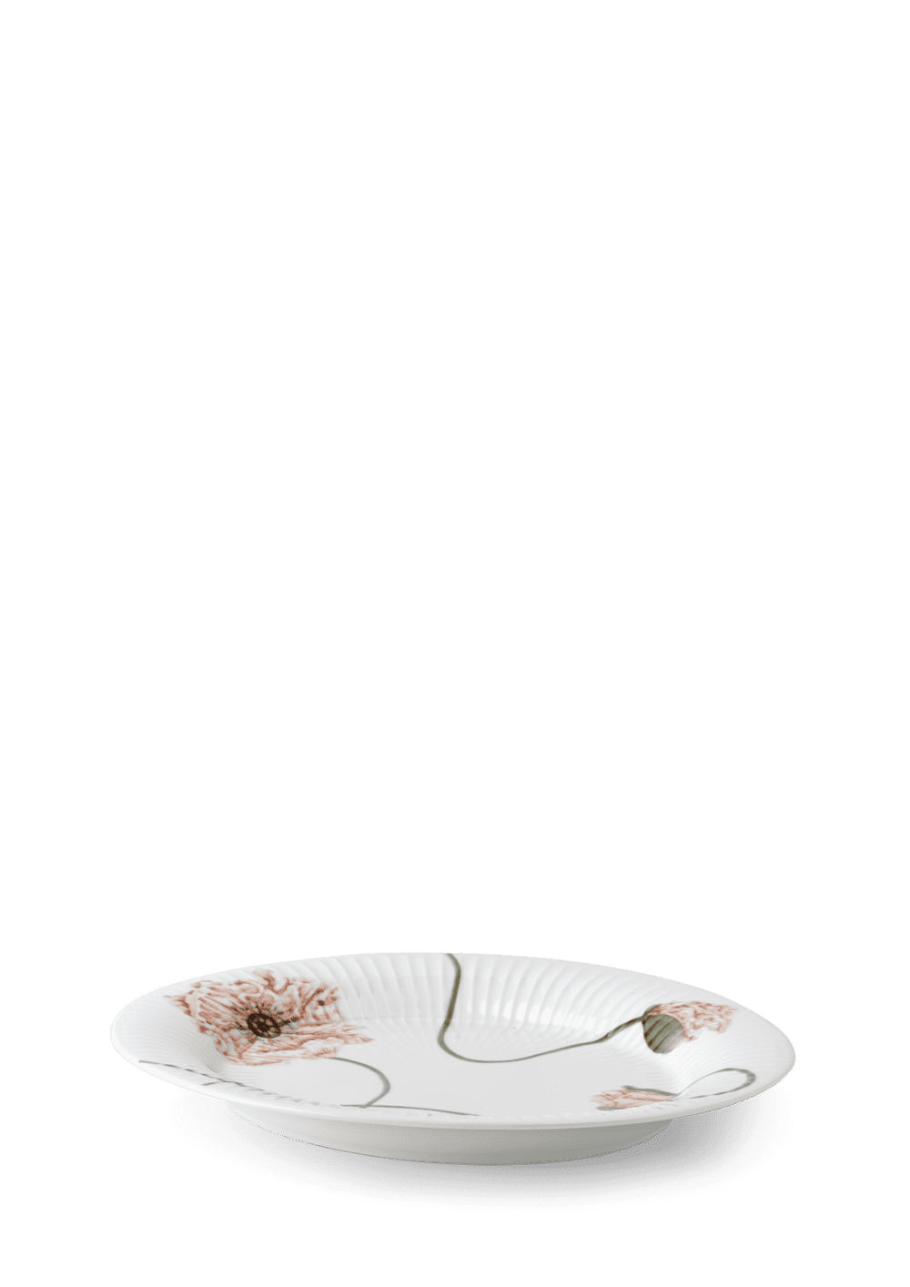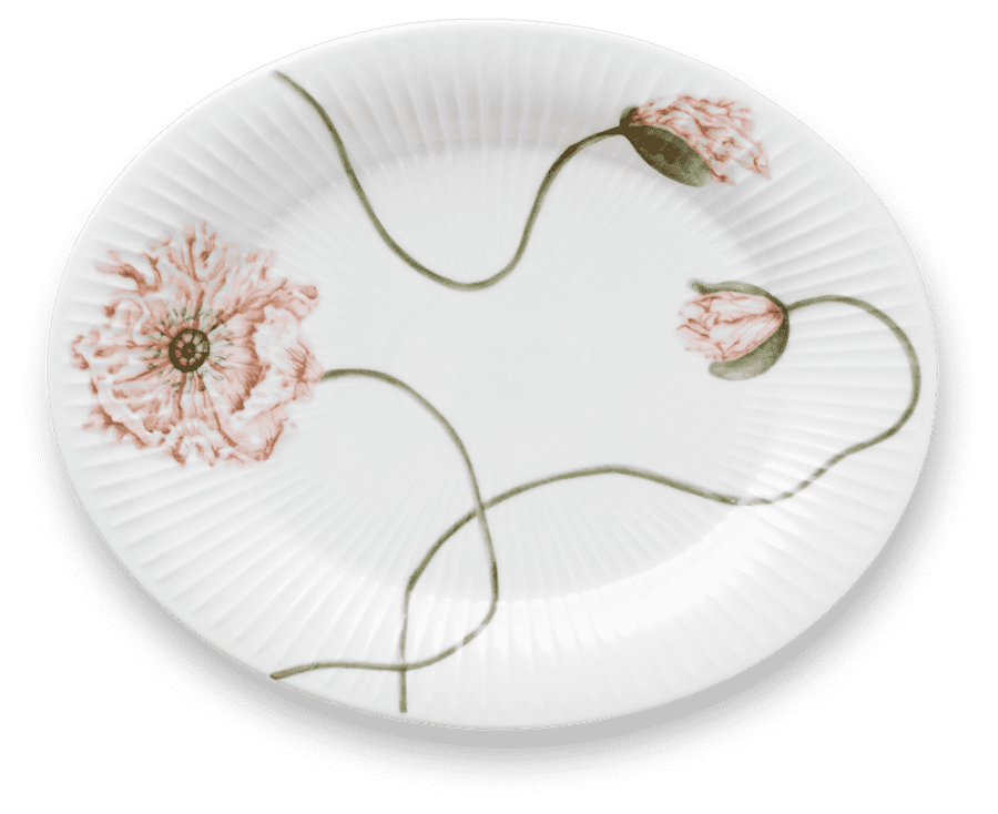 Hammershøi Poppy er en videreudvikling af den populære stel serie Hammershøi. Serien er designet af Hans-Christian Bauer og Rikke Jacobsen dekorerer med smuk almue akvareldekoration på det hvide porcelæn. Hammershøi Poppy er en poetisk fortolkning af valmuen i douce akvarel på klassisk hvidt Hammershøi porcelæn. Det ovale bordfad er dekoreret med smukke Poppy valmuer der spreder sig asymmetrisk på det hvide porcelæn. Fadet er anvendeligt til alle former for servering, både når hele bordet dækkes med Poppy steldele, og når bordfadet bruges i kombination med det klassiske hvide Hammershøi-stel.