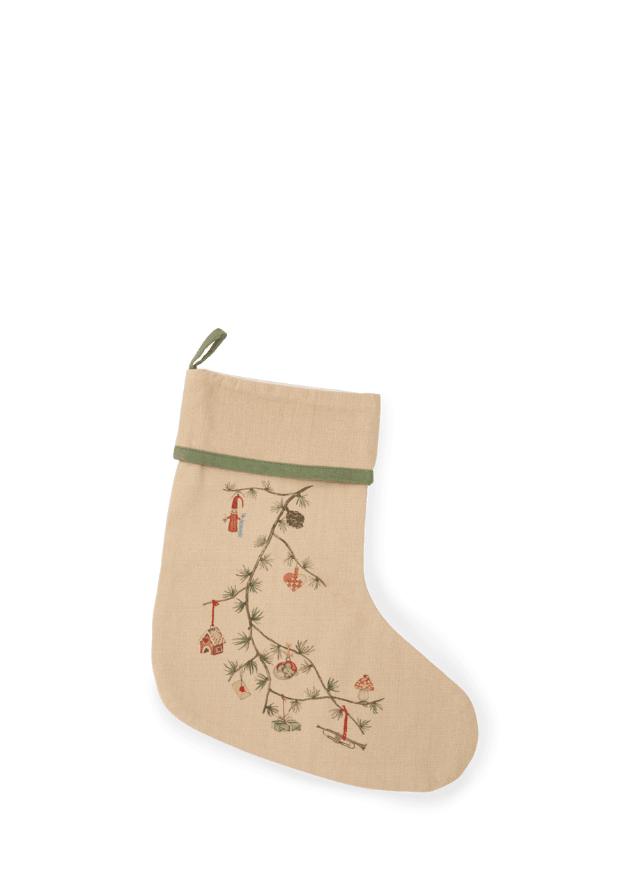 Autentisk julemagi til alle decembers hyggelige morgener. Kählers Hammershøi Christmas er en både klassisk og moderne juleserie, der vækker glæde hos både de mest inkarnerede julefans og stilsikre designelskere. Og med seriens flot udsmykkede julesok får du et både sjovt og stemningsfuldt gemmested til dine kalendergaver og alle dine lækre julegodter. Julesokken er selvfølgelig selvskreven sammen med Hammershøi Christmas-juletræstæppet og resten af seriens stemningsskabende duge og steldele, hvor den afdæmpet og elegant vil sprede julehyggen ud i resten af boligen. Den sandfarvede Hammershøi Christmas-julesok måler imponerende 46 cm i længden og er pyntet efter alle kunstens regler i en smuk kombination af printede motiver med broderede detaljer, hvor cedergrenen med lærkekogler ned langs sokken giver dig den samme finurlige, naturlige og hyggelige pynt, som du kender fra stellet, julekuglerne og kalenderlyset i serien. Læg også mærke til stroppen og den smukt nedfoldede kant i toppen hvor et mørkegrønt kantbånd enkelt og elegant markerer slægtskabet med seriens juletræstæppe. Hammershøi Christmas-julesokken kommer da også i den samme kraftige kanvaskvalitet – et skønt mix af 82% genanvendt bomuld og 18% polyester, der ud over at være flot og funktionelt også er GOTS-certificeret. Det klassiske Hammershøi-stel designet af Hans-Christian Bauer er indbegrebet af Kählers solidt forankrede designfilosofi, hvor seriens diskrete riller giver alle dele en helt særlig autentisk elegance i et moderne og nutidigt touch formet af tradition. Og med en klassisk Hammershøi Christmas-juelsok i Kählers velkendte kvalitet tilført et strejf af julemagi i kunstner Rikke Jacobsens kyndige hænder, har du den perfekte for at bringe minderne om jul som i gamle dage frem side om side med nutidens indretningstrends. (GOTS ”Organic” Certified by Control Union, CU1026087)