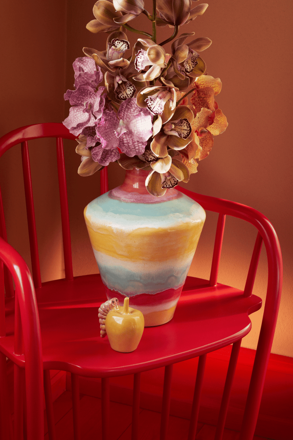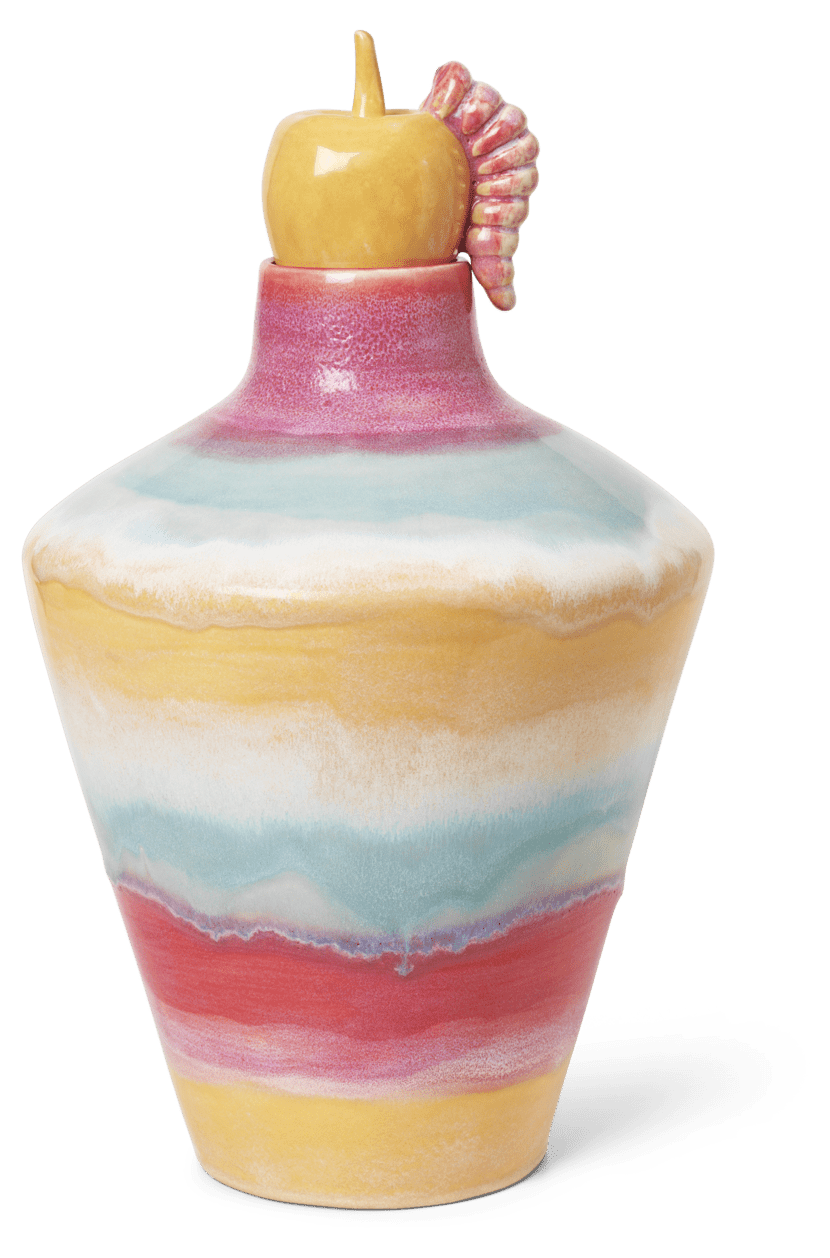 Farverig popkultur møder håndlavede designtraditioner i samarbejdet mellem Kähler og designduoen KIMPOP, der tæller de farverige personligheder Sofie Linde og Joakim Ingversen. I en årrække har duoen med stor passion udforsket keramikkens verden, og deres viden om glasurer, brænding og det keramiske håndværk forener de med deres kærlighed til pop og populærkultur med udgangspunkt i de sene 80’ere og tidligere 90’ere, som de selv er rundet af. Og resultatet? Kollektionen Poppery, der er lige så farverig som Sofie og Joakim. KIMPOP ønsker at udfordre danskernes brug af farver i boligen, bryde med de traditionelle skandinaviske farvetraditioner og invitere os til at tage flere farverige chancer i indretningen. Den nye kollektion fra Kähler X KIMPOP er et selvsikkert mix af pasteller, opulente glasurer, humoristiske detaljer og former, der vil frem i verden. Den største af vaserne på 32 cm i højden har en unik æbleformet prop i gul med en finurlig detalje: en lille lyserød kålorm. For hvorfor skal vasen egentlig bare stå og gabe, når der ikke er blomster i? Med sit iøjefaldende design fungerer vasen som et statement piece og vil øjeblikkeligt tilføje et farverigt og legende element til indretning og et boost af livsglæde.