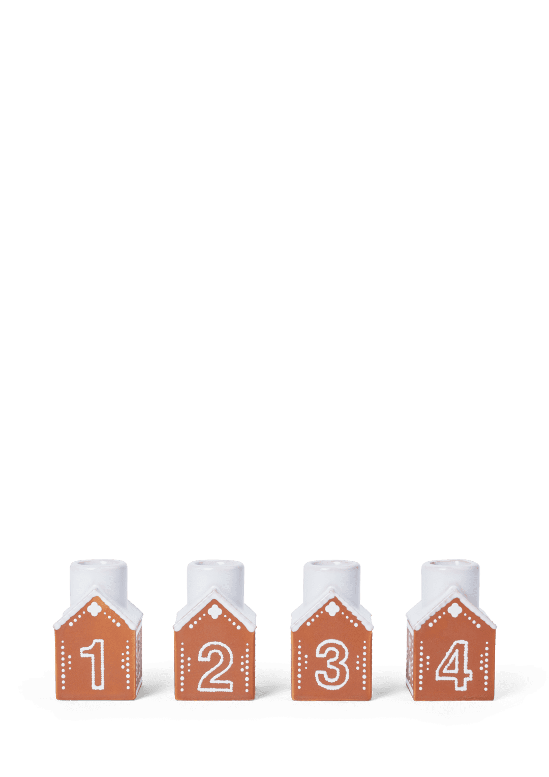 En smagfuld juleklassiker i håndlavet keramik. Kähler Gingerbread er en serie af moderne honningkagehuse og ophæng fra Kähler, hvor kombinationen af et charmerende udtryk og håndlavede designtraditioner møder varmen fra fyrfadslysene og de klassiske juletraditioner, der skaber både stil og hygge. Bagværk hører julen til, og med sit naturtro udtryk er det det let at forestille sig, at Kähler netop har taget en nybagt honningkage ud af keramikovnen. Ja, du kan næsten dufte den, men tag ikke fejl – hele Gingerbread-serien er skabt i stentøj, og den hvide glasur er keramisk. Kähler Gingerbread Adventstagen måler 7,5 cm i højden og består af fire små minilyshuse til kronelys, der med sirlige mønstre og sne på taget supplerer de store Gingerbread-lyshuse perfekt. Hvert hus er udsmykket som en traditionel adventslysestage med håndtegnede tal fra 1 til 4. Og er du mere til nummerering udtrykt som et dekorativt mønster, så har du mulighed for at vende dem om og lade hver søndag i advent blive illustreret i de fineste snekrystaller – nøjagtig som man ville dekorere et honningkagehus. Gingerbread-adventsstagen giver en nostalgisk og varm følelse til hjemmet og skal selvfølgelig gemmes i generationer og tages frem år efter år som en smuk og hyggelig tilføjelse til julepynten i familien. Mette Bache og Barbara Bendix Becker er designerne bag Kähler Gingerbread, og deres formgivning er kendetegnet ved mødet mellem det stringente og det autentiske. Lyshusenes geometriske flader blødes op af de sirlige dekorationer og de mange vinduer og døre, der alle – stor som lille – er udskåret i hånden, så lyshusene får et naturligt og hyggeligt udtryk. Og på samme måde er adventsstagen enkel og grafisk, men fuld af liv og autenticitet i kraft af dekorationerne og det håndlavede udtryk.
